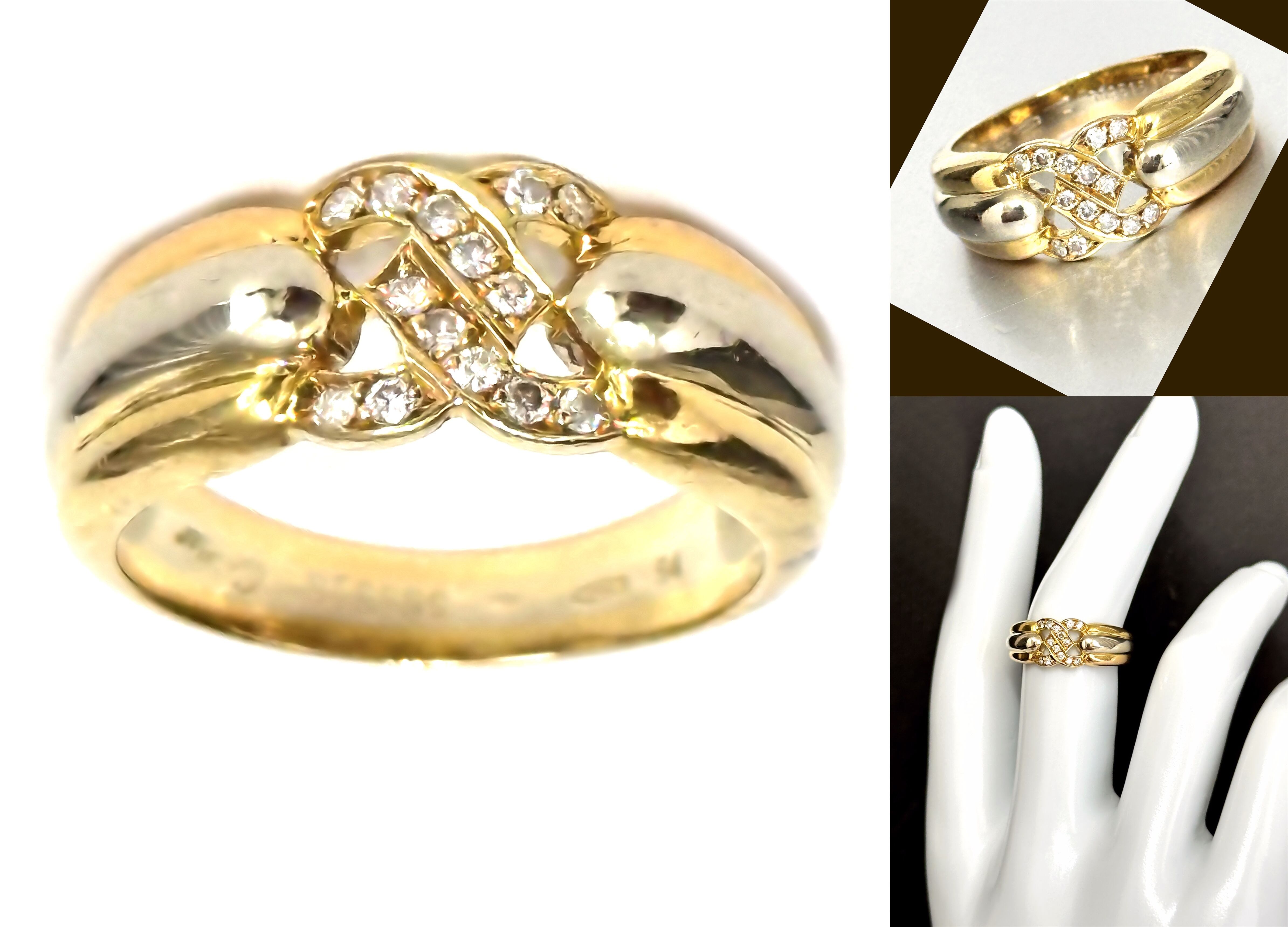ホワイトゴールド、ピンクゴールド、イエローゴールドの3カラーとなっており、スタイリッシュで豪華なダイヤモンドリングです。