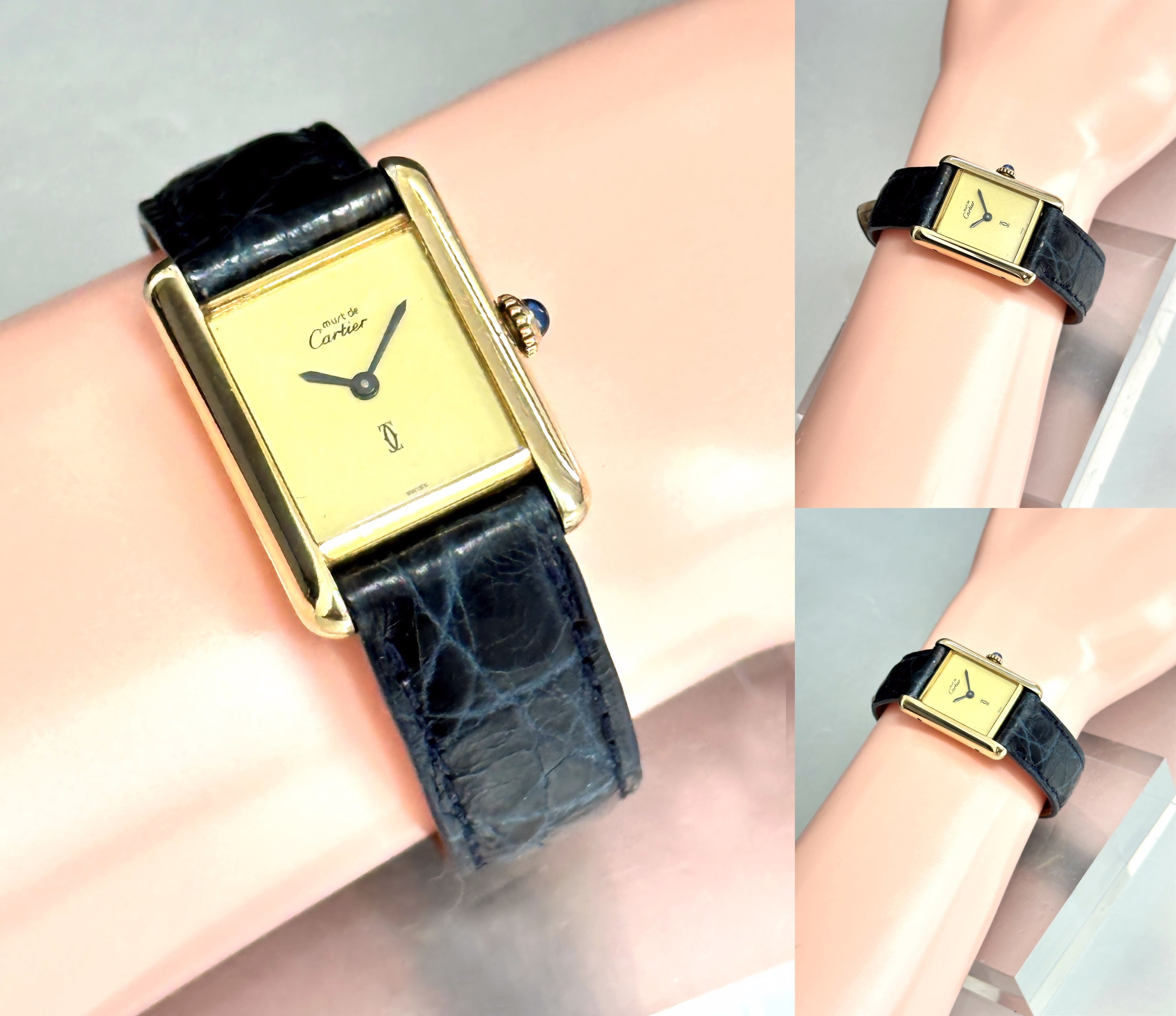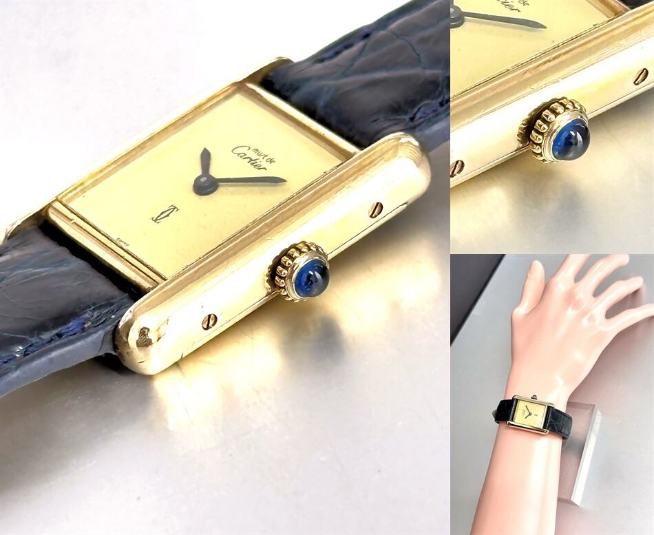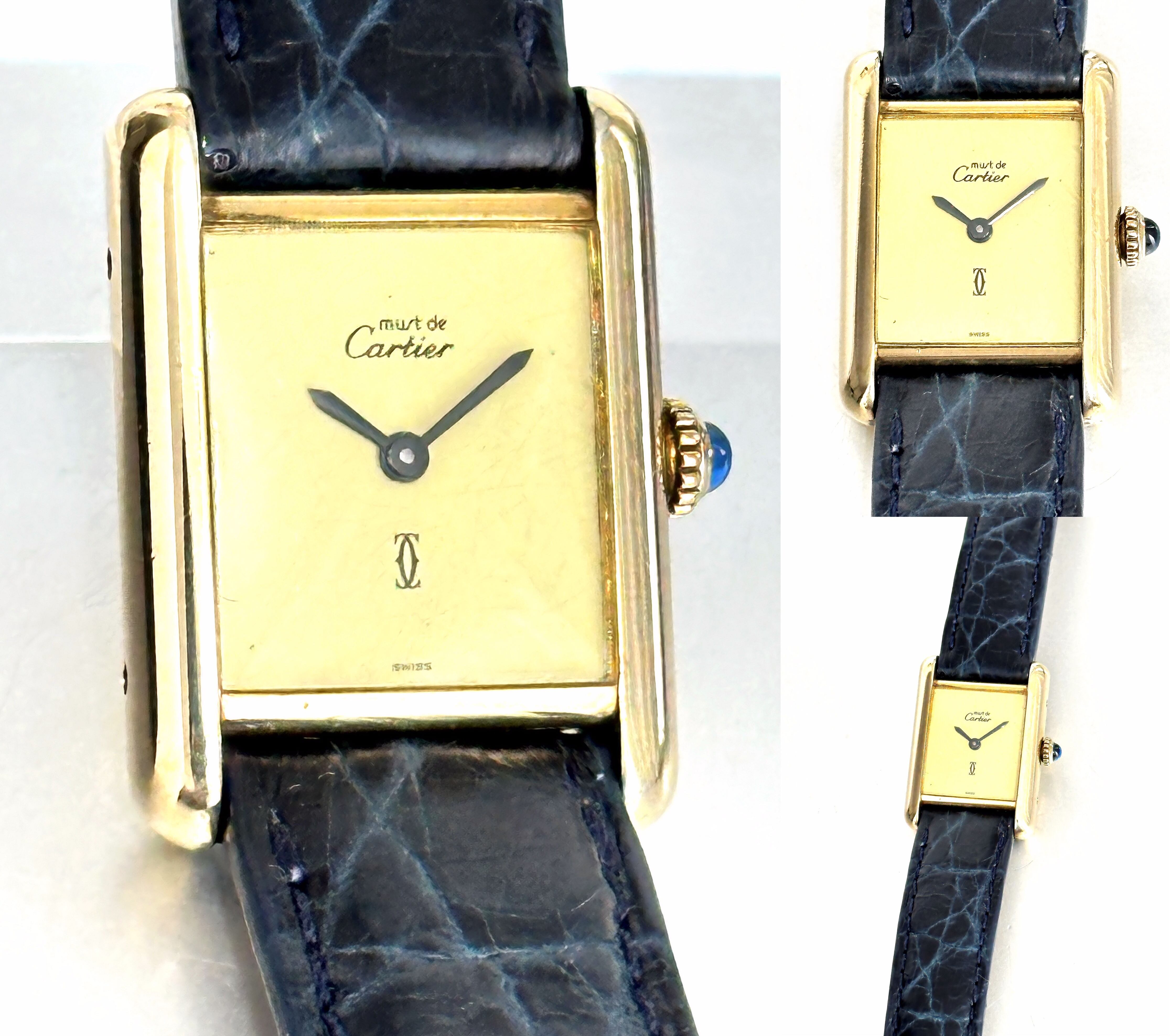 Cartier カルティエ TANK MUST WATCH SM カルティエ マストタンク ヴェルメイユ×925 手巻き 純正クロコレザーベルト ブラック&ブルー 純正尾錠