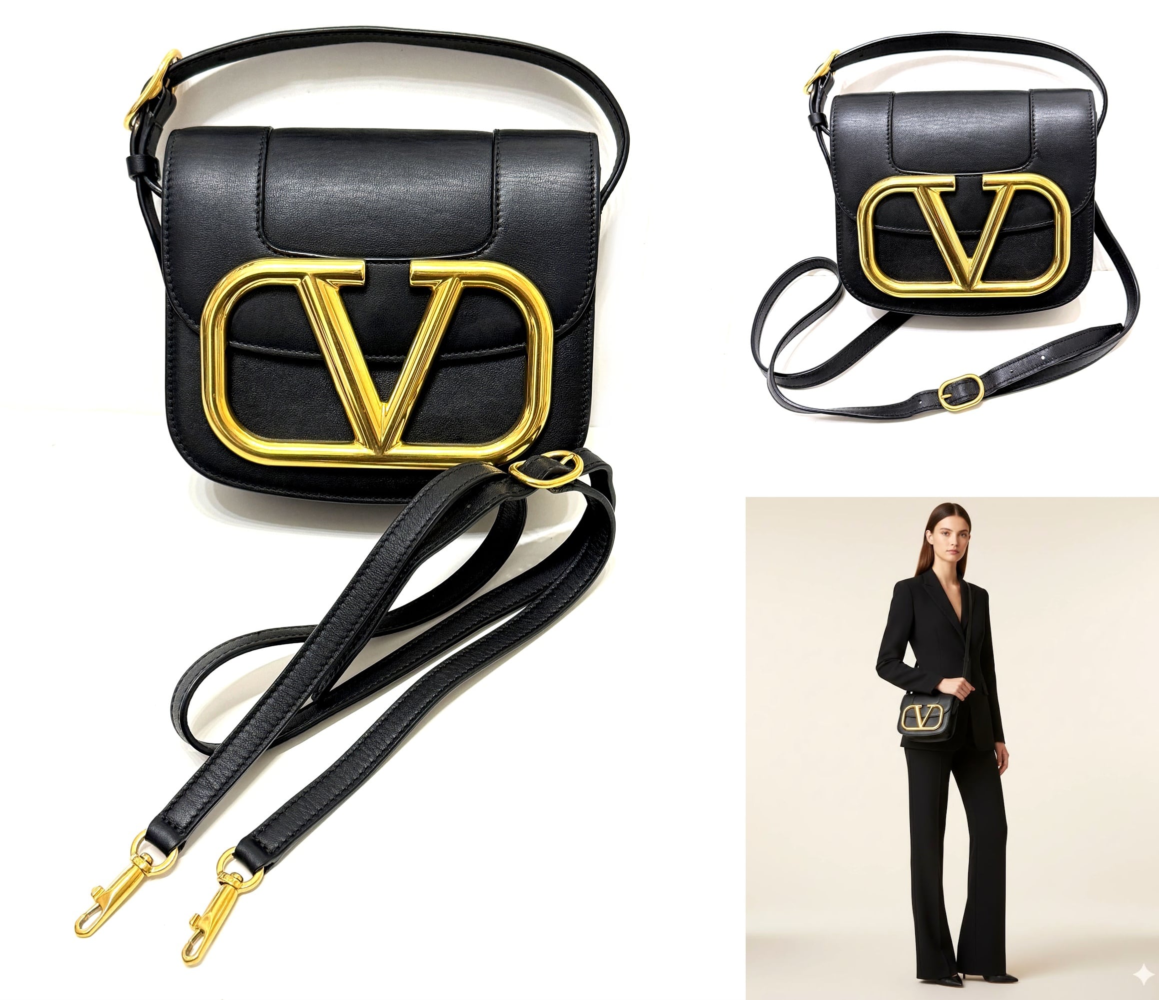 丸みを帯びた小ぶりなフラップやボディに対して、大胆に配したVロゴがリュクスな存在感を放つ。