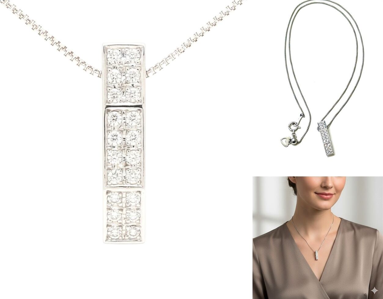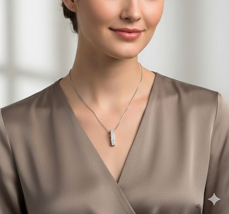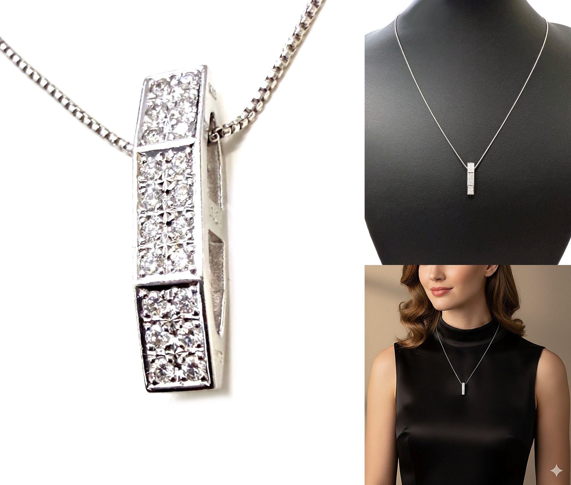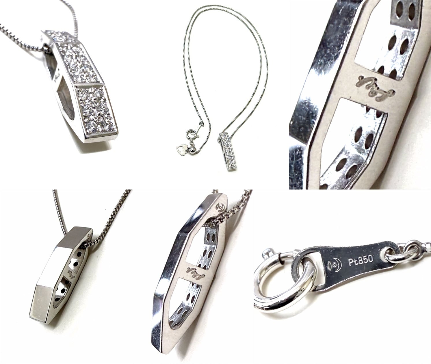 上質な輝きを放つ20石の透明度の高いダイヤモンドに、プラチナチェーンとホワイトゴールドの存在感あるフラットバーペンダント。