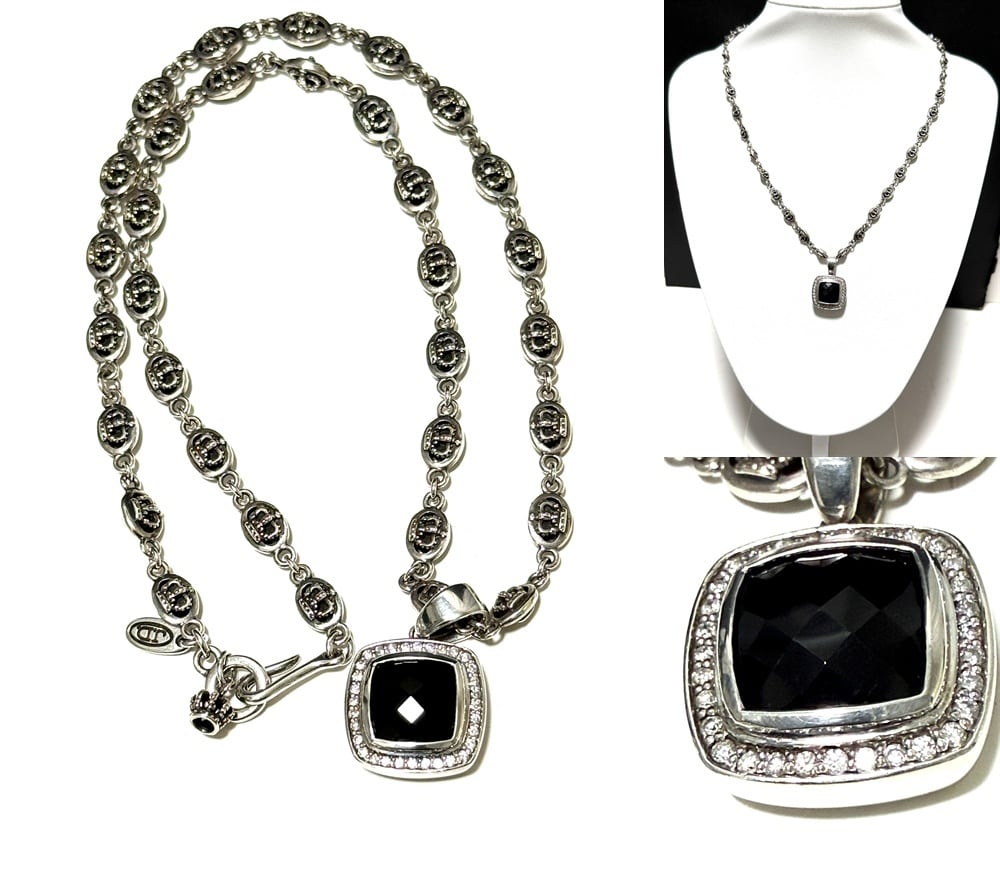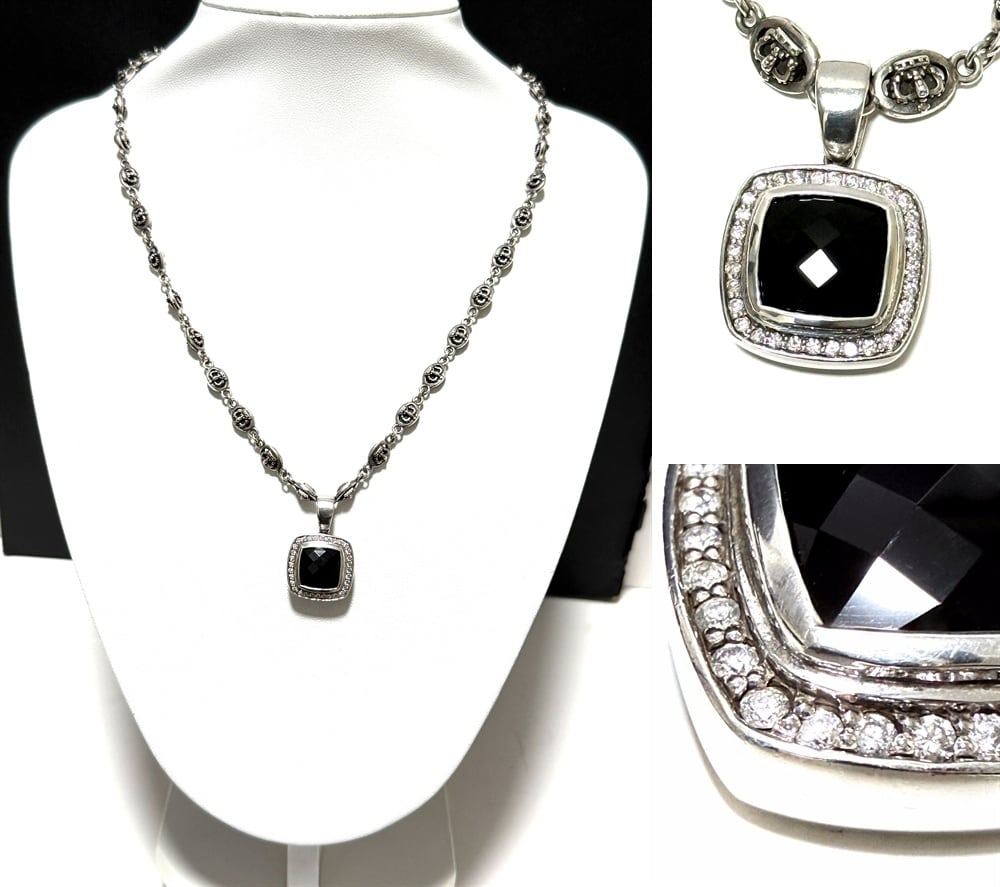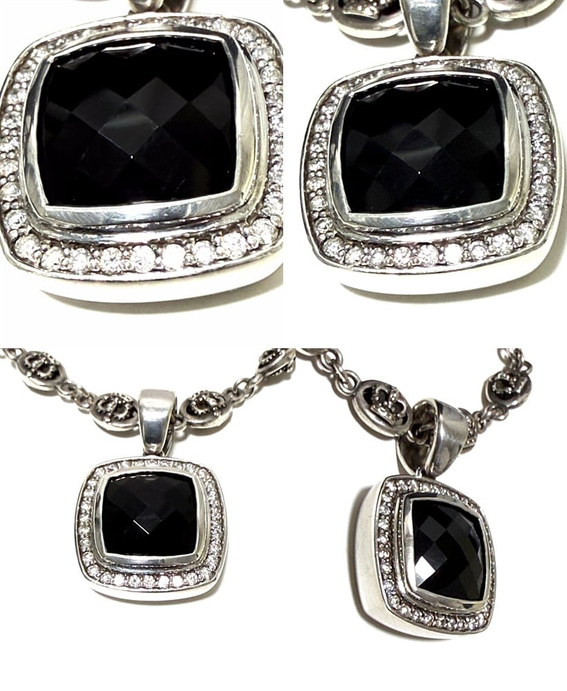 ミラーカットを施した大きなオニキスと、それを取り巻く32石のダイヤモンドが存在感あるペンダント。