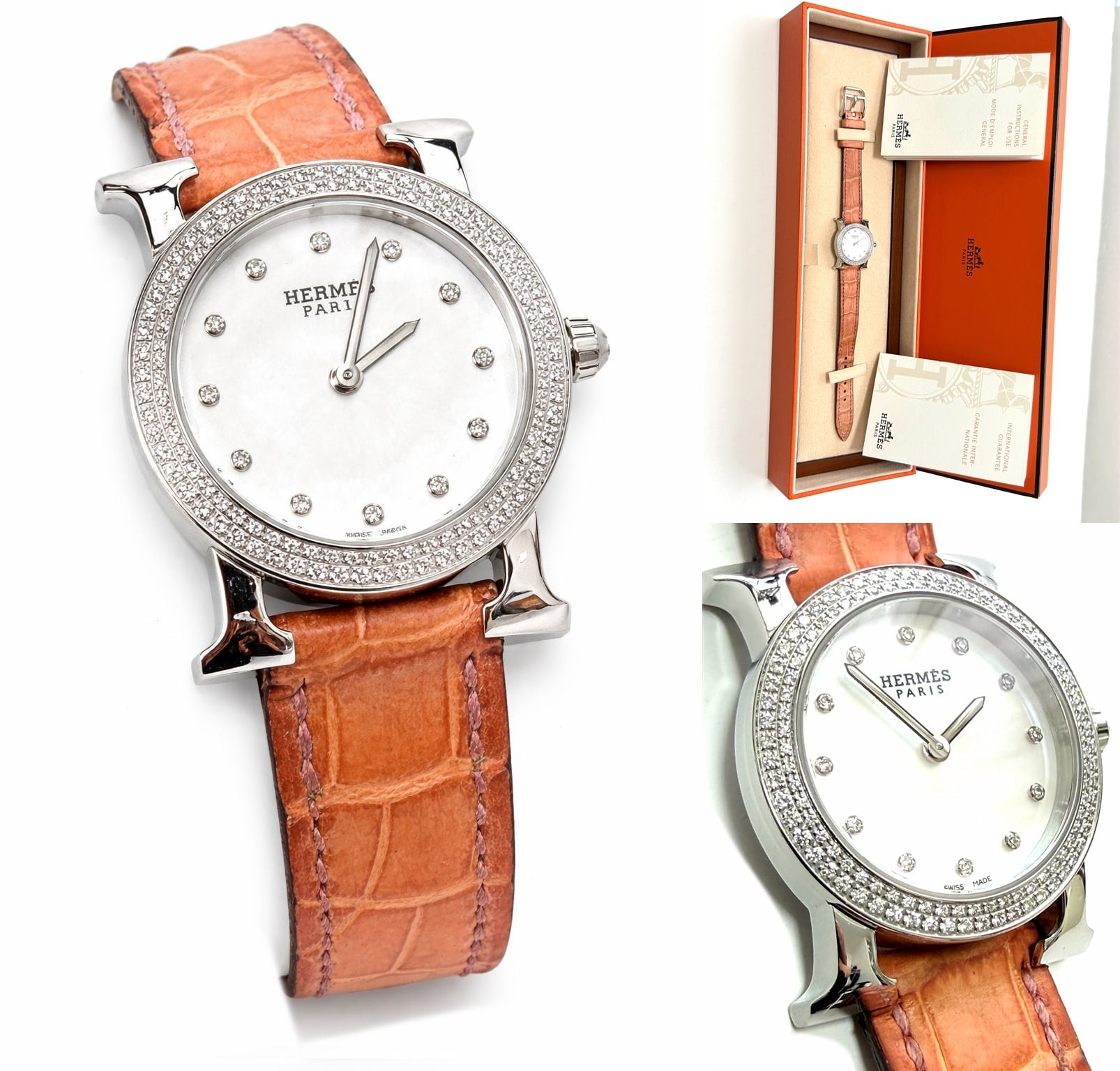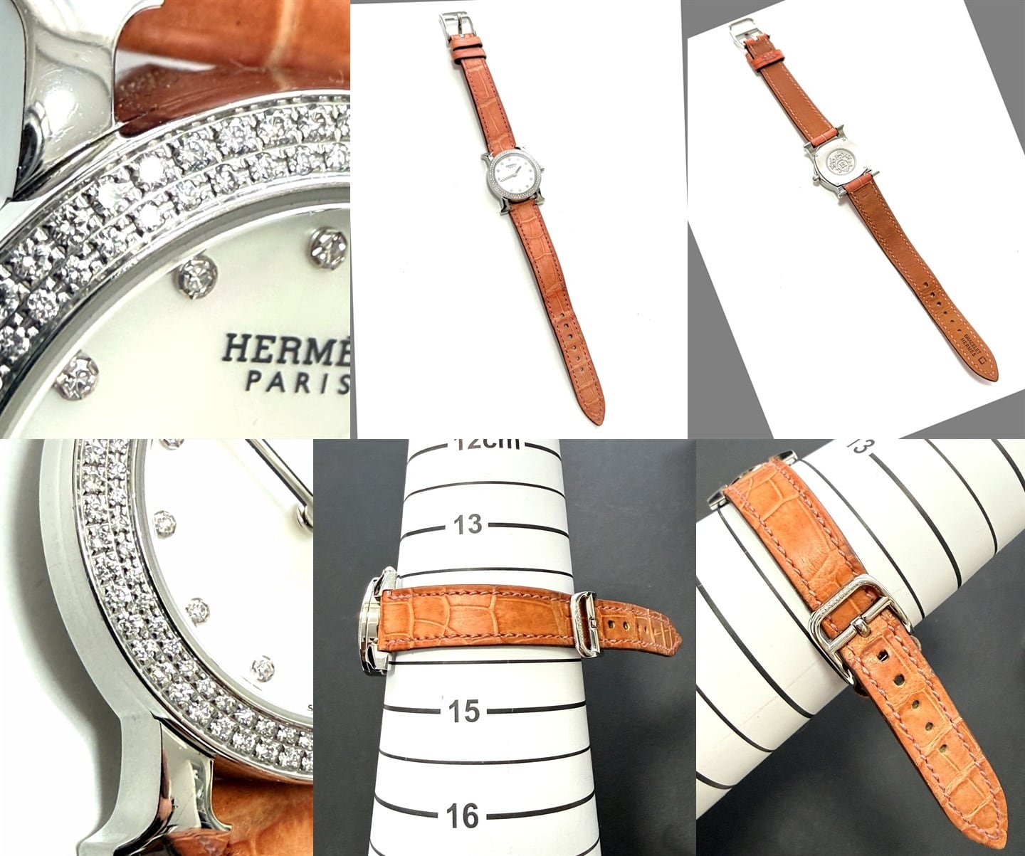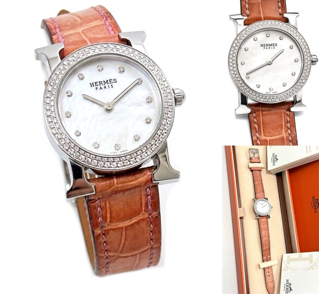 HERMES エルメス Hウォッチ ロンド ダイヤモンド シェル 純正 パヴェ ダイヤ 時計 レディース ケース付き