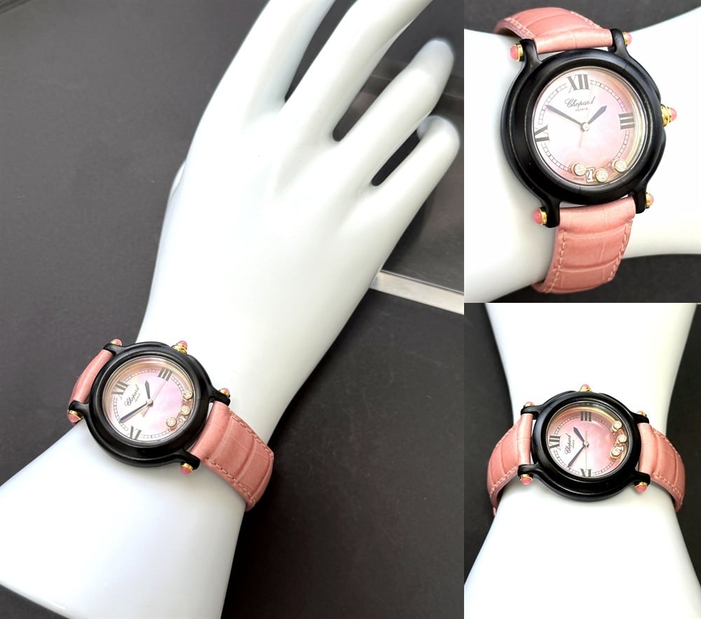 文字盤の中にはムービングダイヤモンドが動き回り、ダイヤの輝きも上質で透明度も高く、ショパールを代表するアイコンを楽しめる名品です。