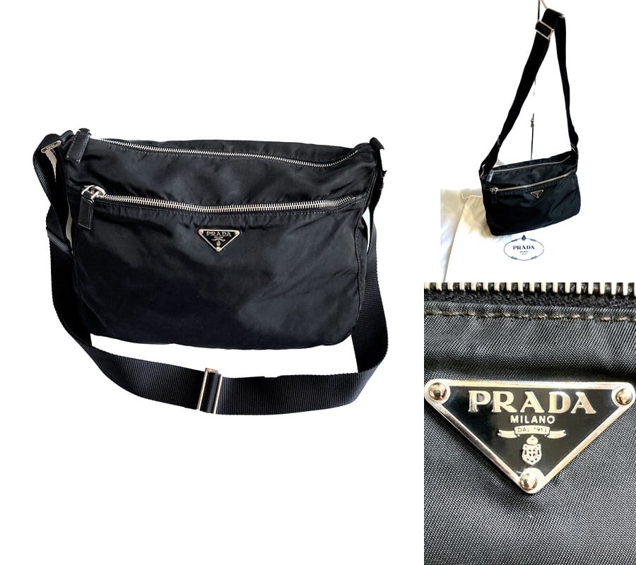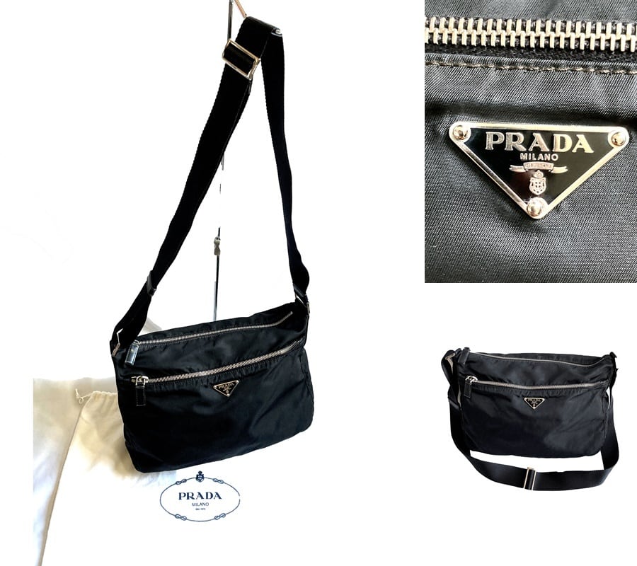 美品 正規 本物 定価14万 PRADA プラダ ブラック リモンタナイロン ロゴプレート ショルダー バッグ メンズ 男女 黒