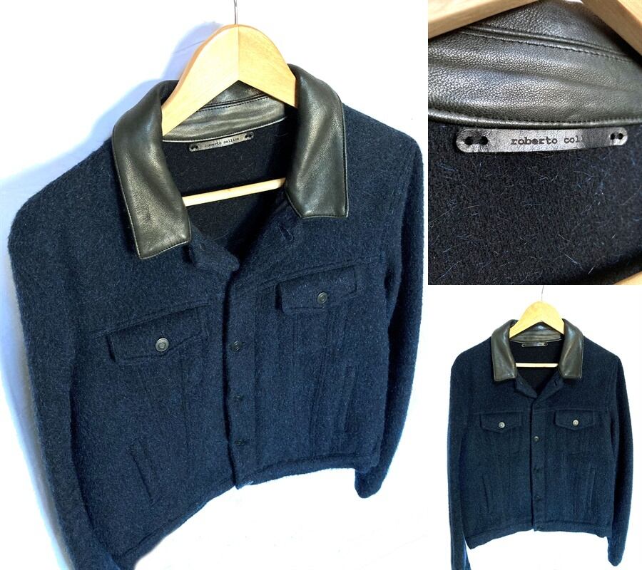 美品 レア roberto collina ロベルトコリーナ メンズ モヘア ウール レザー ジャケット 48 G 定価10万 ブルー 秋冬