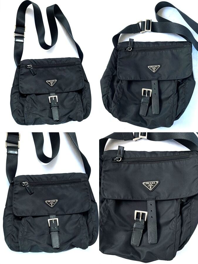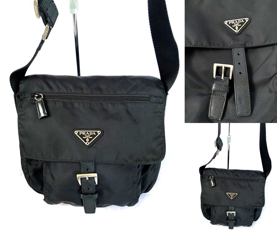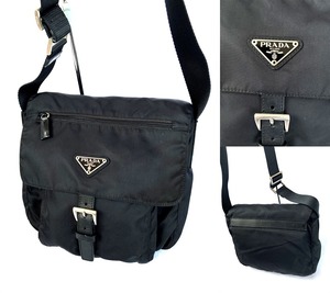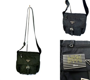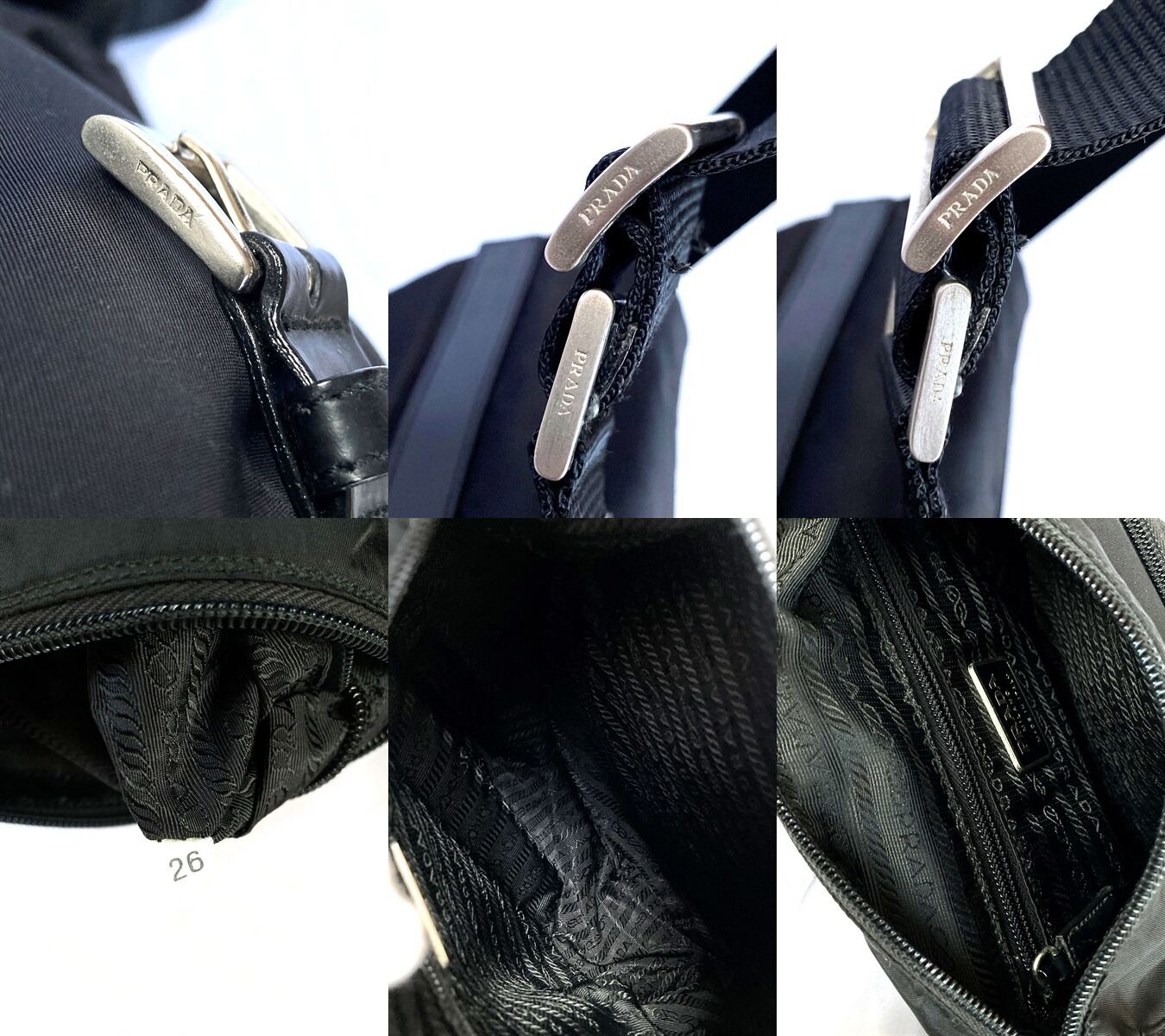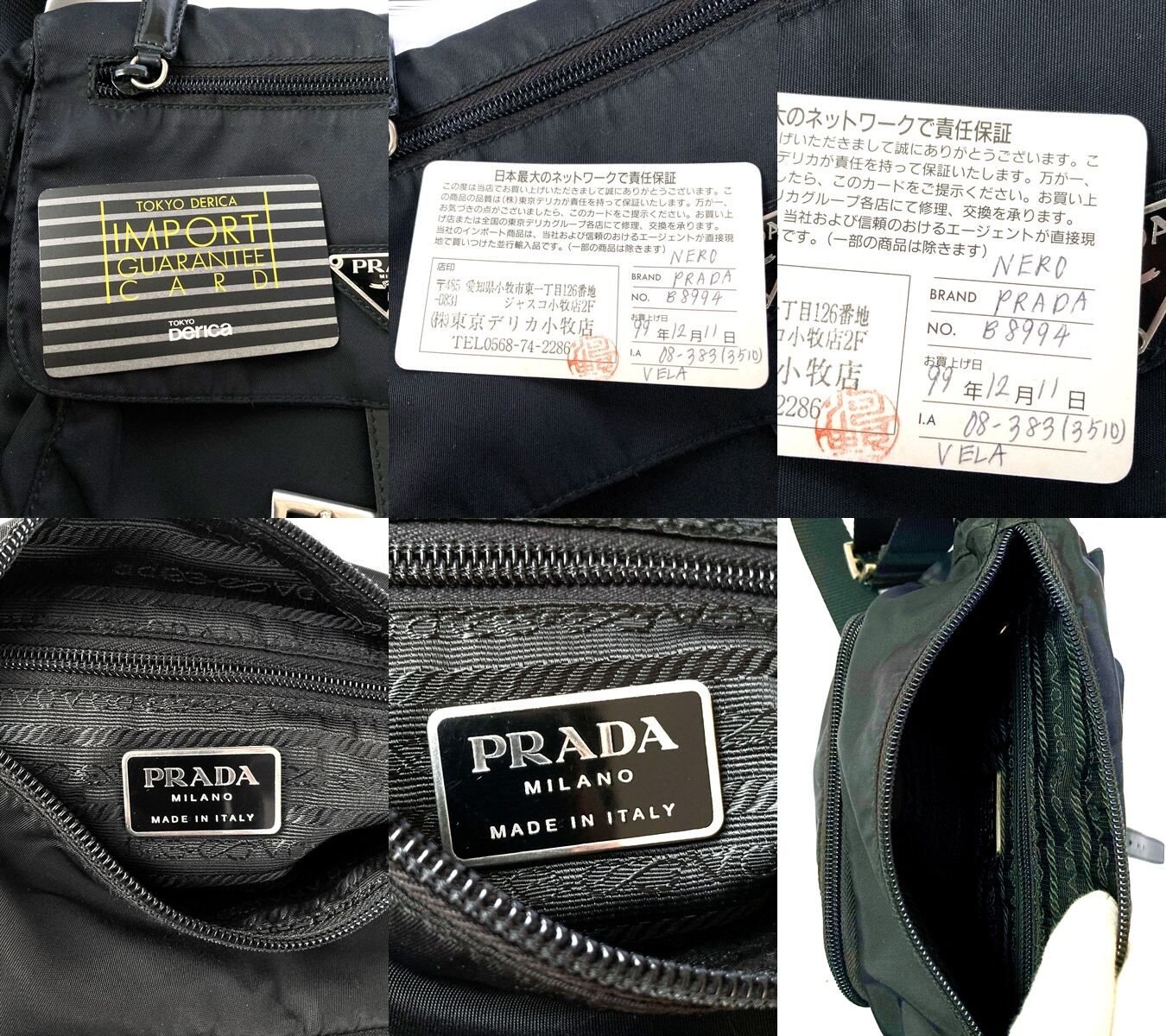 美品 国内正規 ギャラ付き 定価13万 PRADA プラダ ロゴ プレート リモンタナイロン レザー ショルダーバッグ ブラック