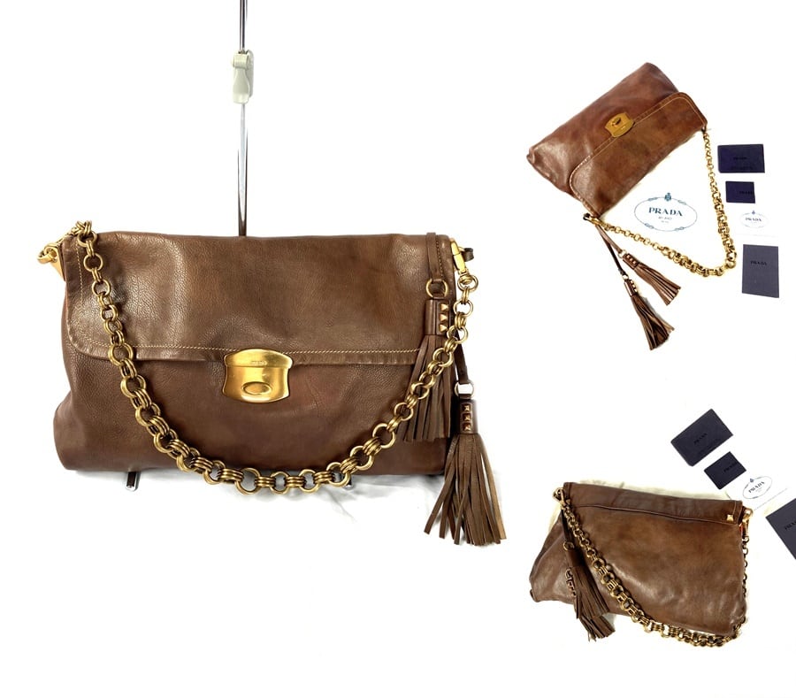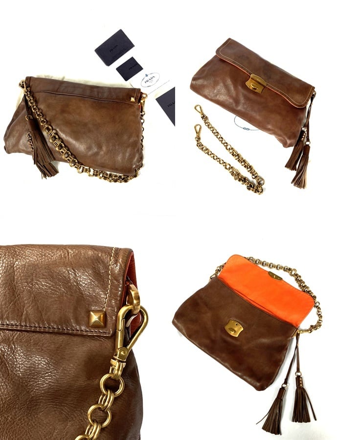 シンプルかつ高級感溢れる柔らかい上質なレザーに、フロントのゴールドバックルにはPRADAの刻印があり、金具類はチェーンも全てゴールドで統一されていて、ダークブラウンのレザーにマッチしていて上品で高級感あります。