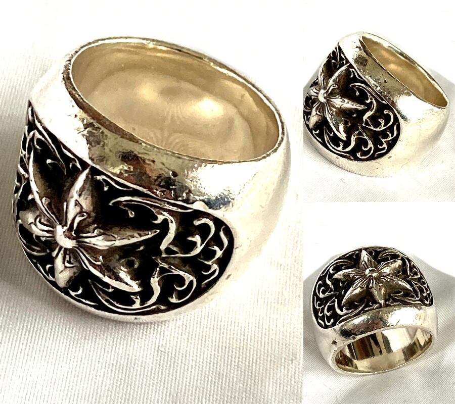 リングの表面に大きく刻まれたオーバルスターを埋めるように刻まれた美しい曲線のモチーフを丁寧に燻し、より立体的に表現されています。