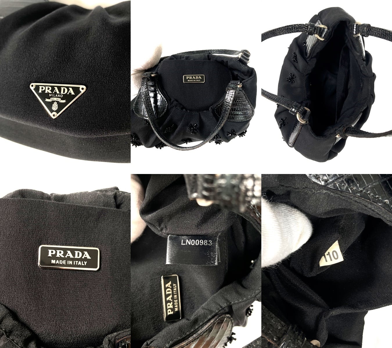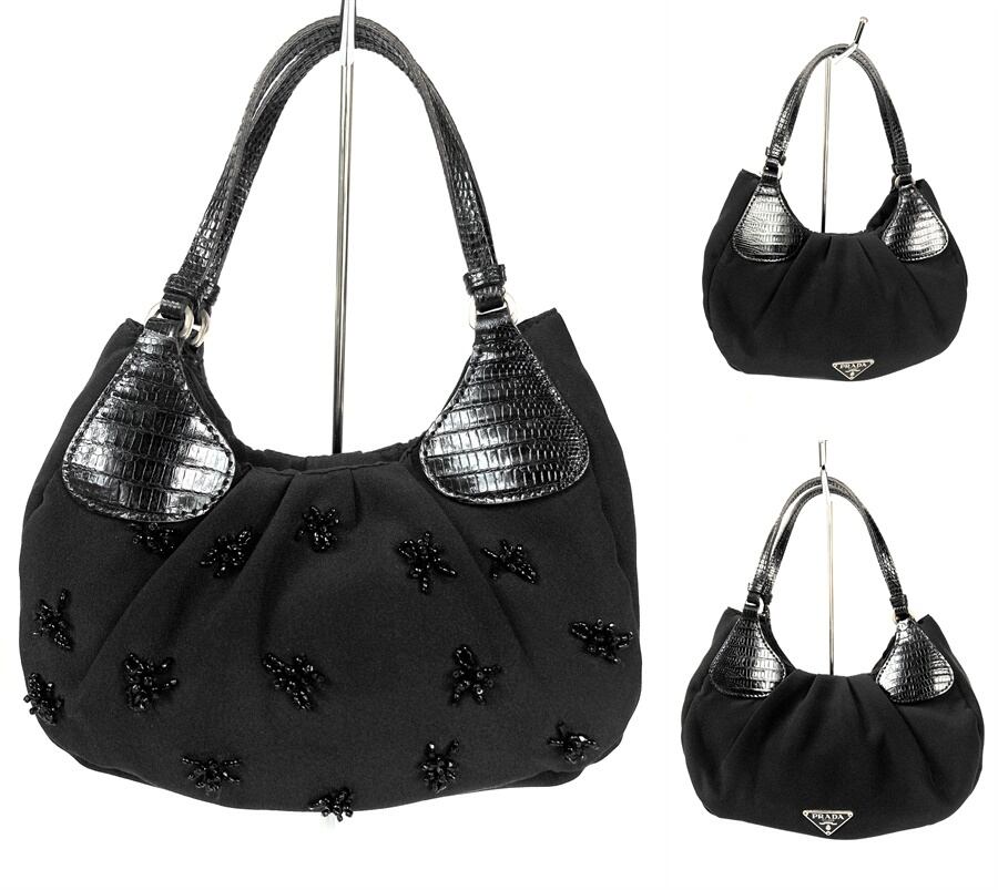 PRADA プラダ ロゴプレート レザー サテン&シルク スパンコールビーズ ミニ ハンドバッグ