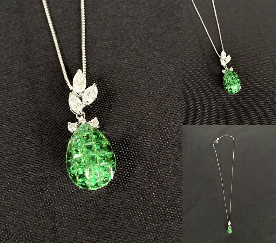 最高の透明度をもつ2.05カラットのグリーンガーネットに、フラワーモチーフの0.28カラットダイヤモンドをデザインした高級感ある上品なネックレスです。