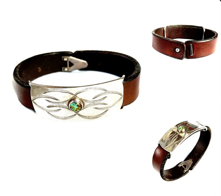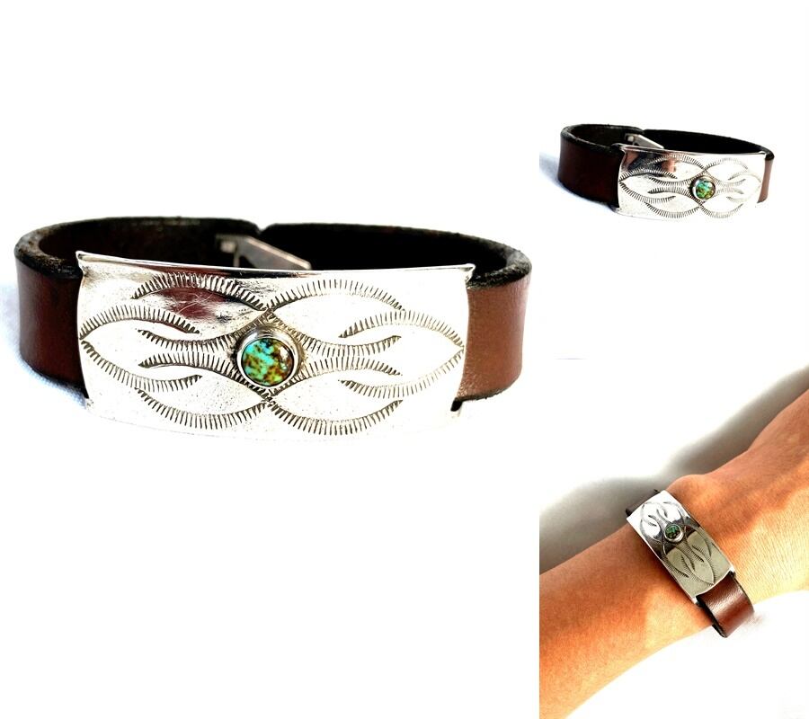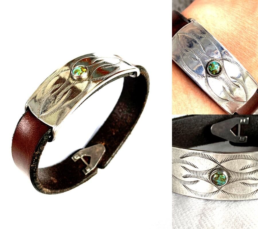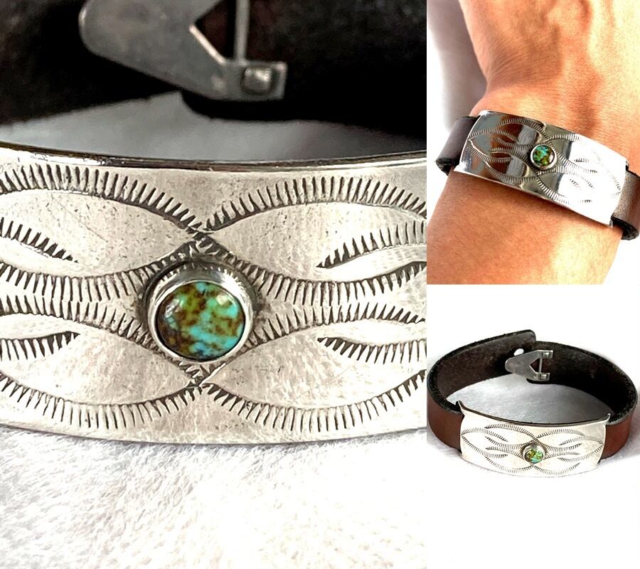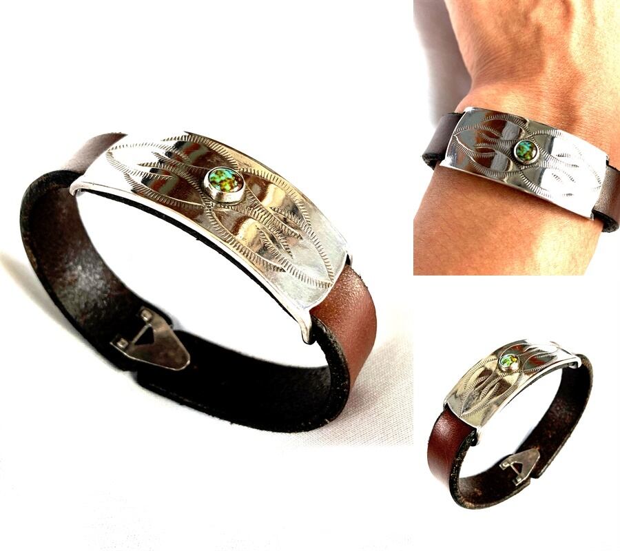 ヴィンテージの味のある牛革レザーに、真ん中にホワイトターコイズをデザインして、その周りをシルバ-925プレートでデザインしたバングルです。