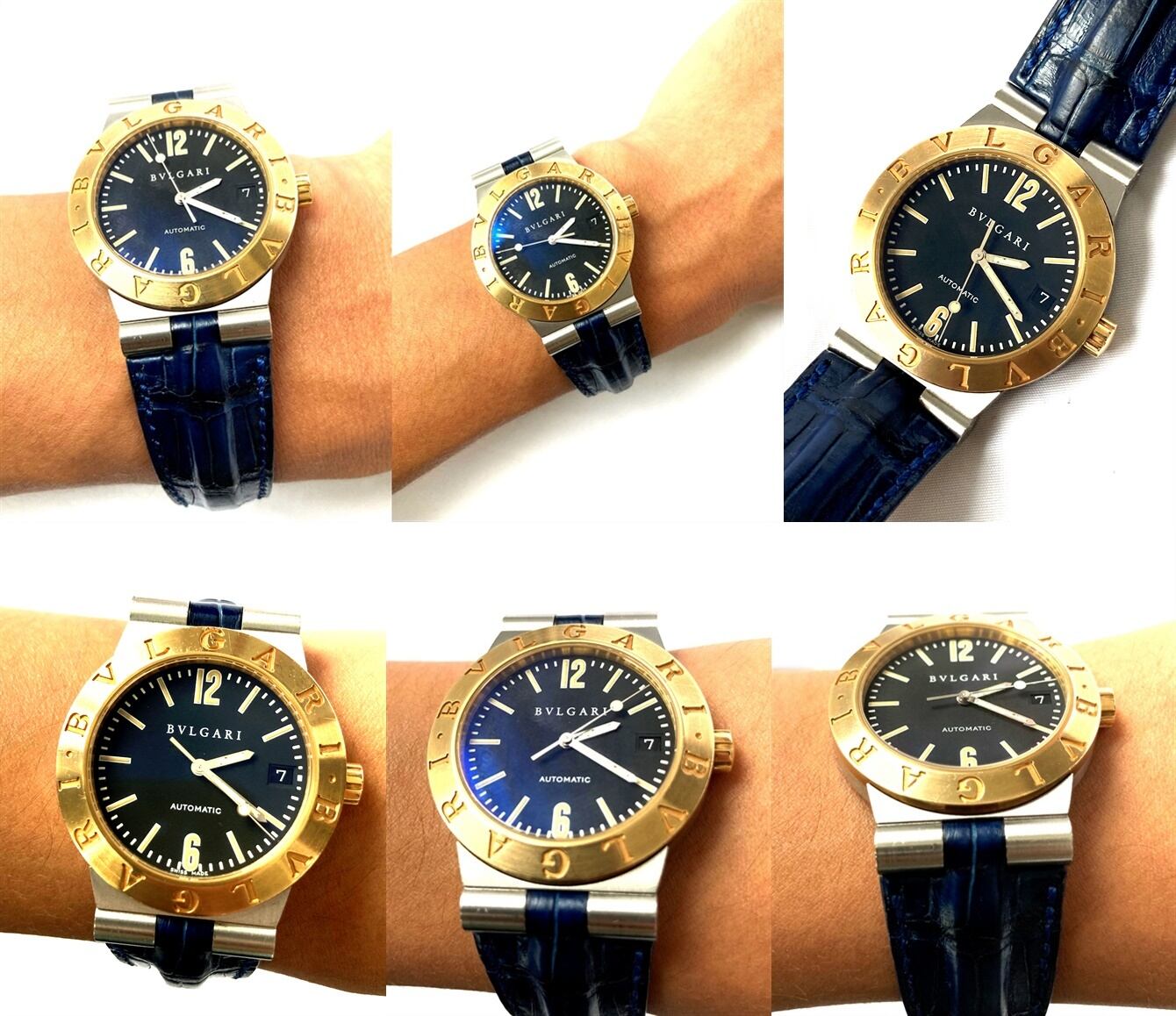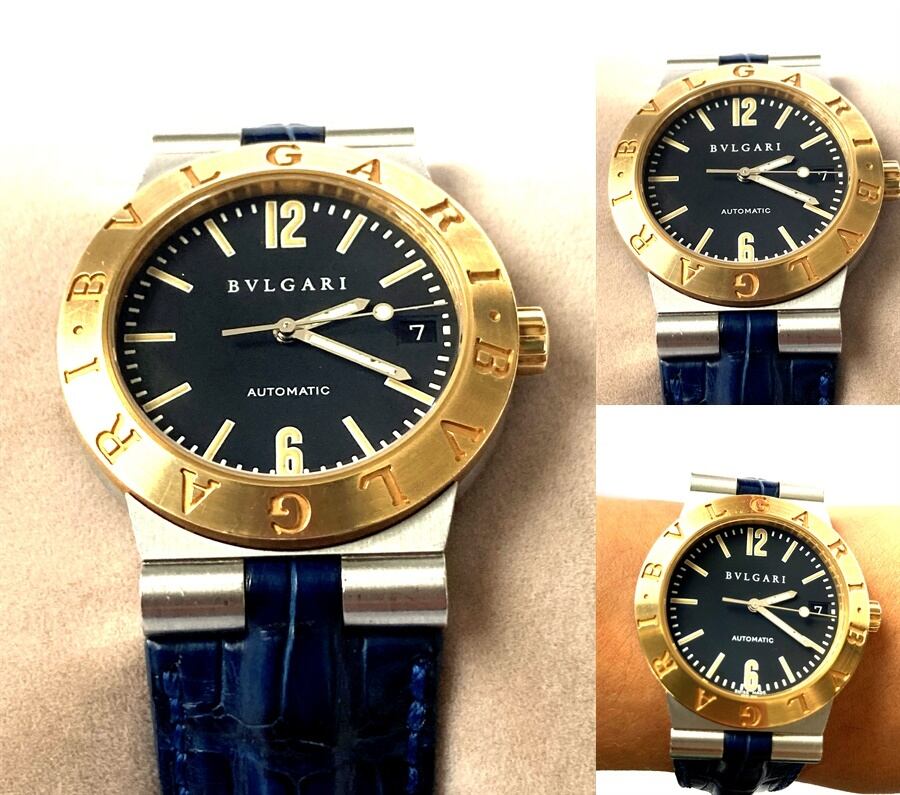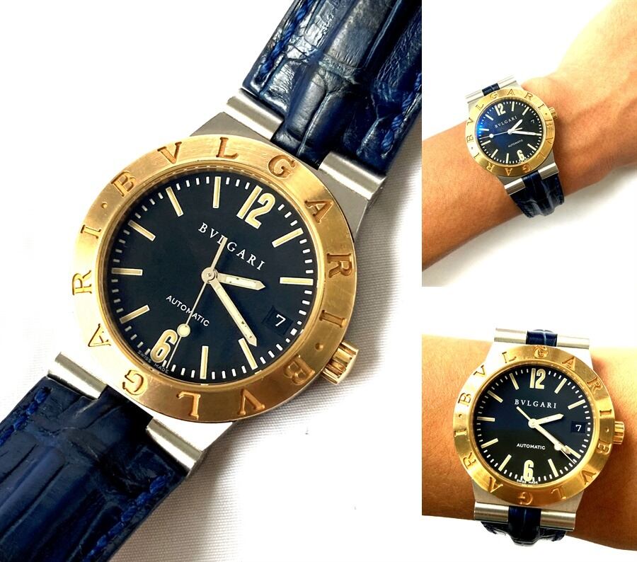 落ち着いたBVLGARIベゼルにはK18(750)ゴールドを使用し、大人の雰囲気漂う型押しの高級感あるダークブルーのレザーベルトで、カジュアルにもドレスライクにも着こなせます。