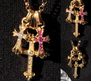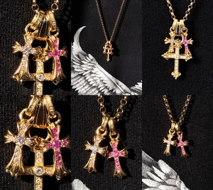 クロムハーツの王道の22Kパヴェのタイニーファットに22Kベビーファットのパヴェを合わせるのではなく、あえてジャスティンのゴールドクロスを組んでいるのがポイントです。