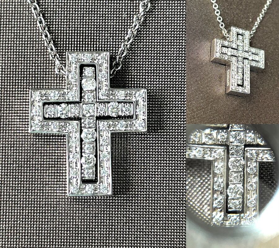 立体的な二重構造のクロスが胸元で揺れ、華やかな存在感を放ちます。