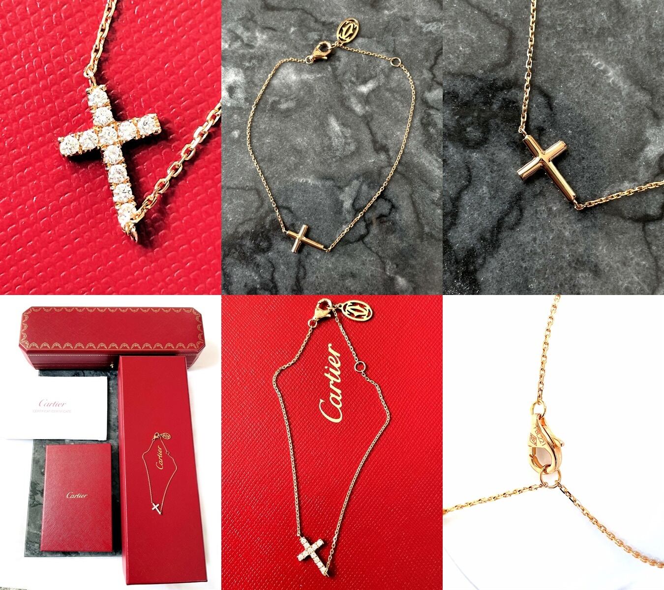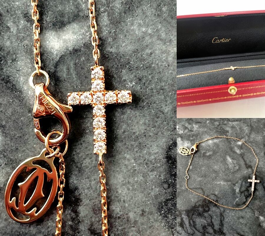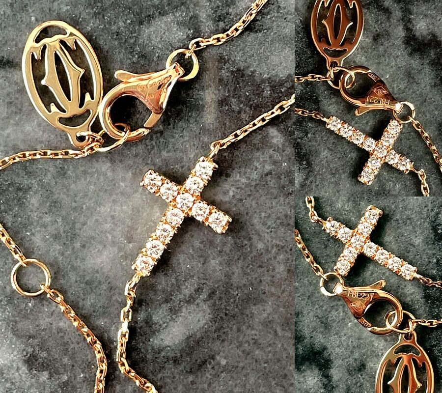 美しく大人っぽい上品なピンクゴールドに、11ポイントのカルティエのクラリティの高い純正ダイヤモンドを11ポイント詰め込んだカルティエのシンボルクロスが高級感あります。