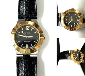 BVLGARI ブルガリ K18 YG / SS ディアゴノ デイト AT オートマチック 自動巻き 時計 ブラック & ゴールド クロコ型押しレザー