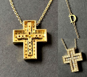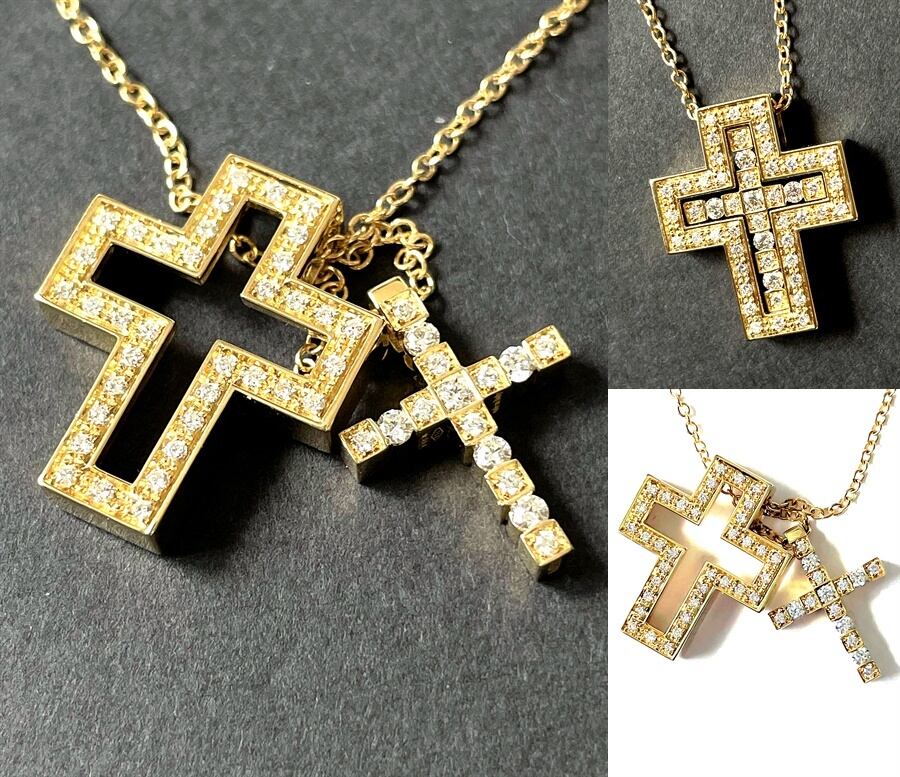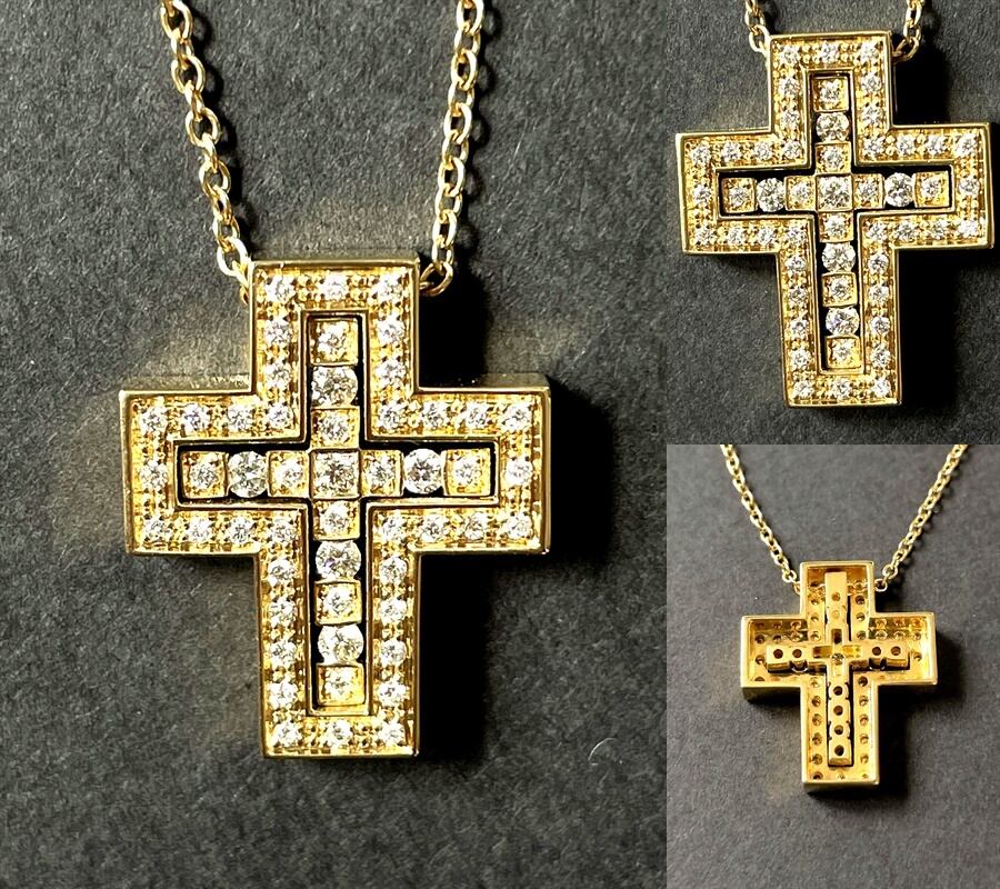 贅沢なダイヤモンドラインが外周を取り巻き、身体の動きに応じてふたつの端正なクロスモチーフが揺れ動き、さらなる高級感ある光を放ちます。