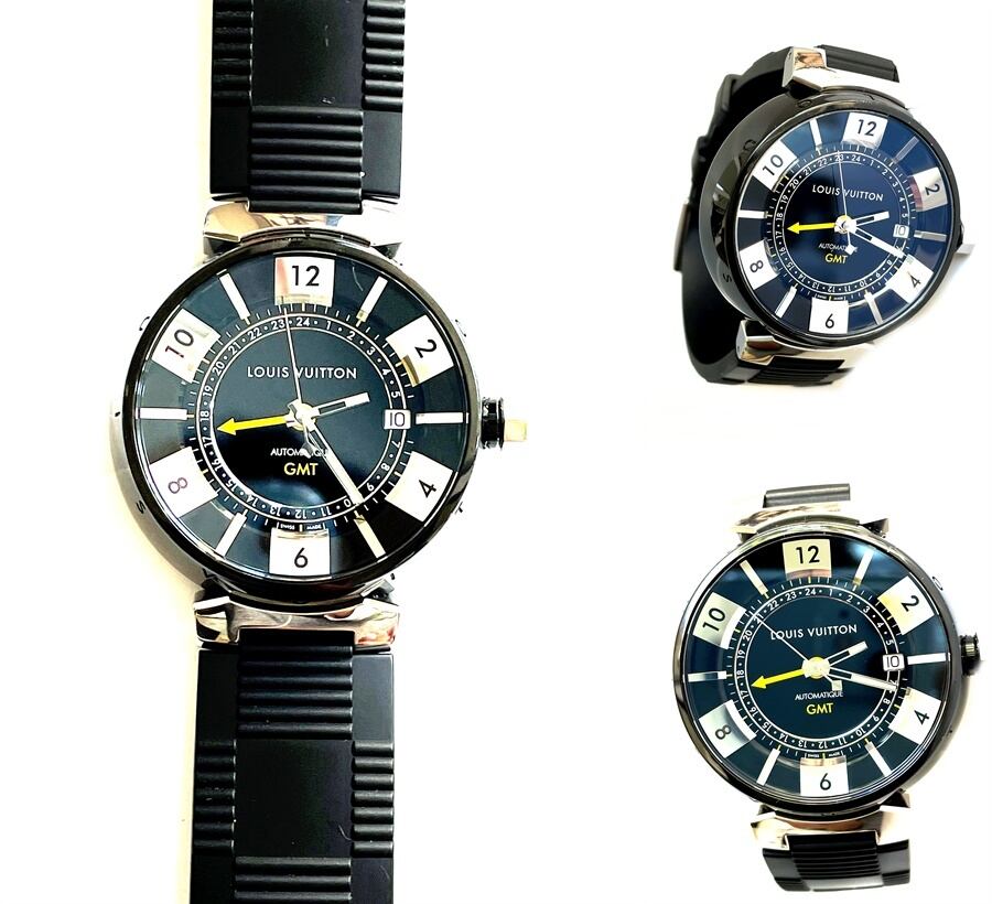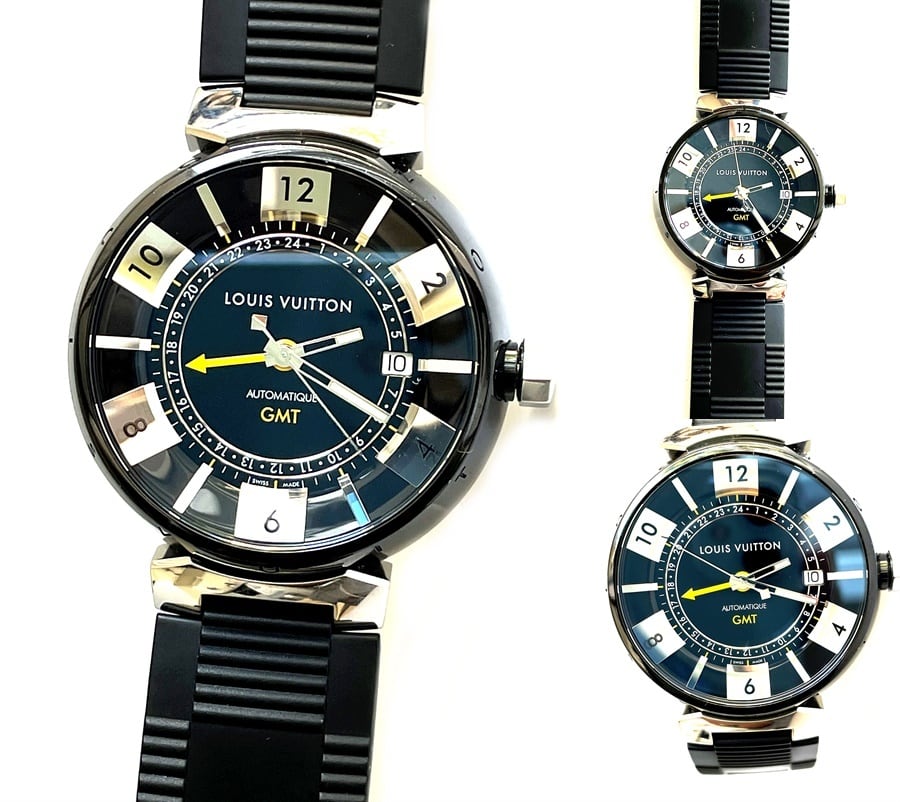 LOUIS VUITTON ルイヴィトン タンブール GMT インブラック オートマチック Q113K メンズ 自動巻き 純正 ダミエラバーベルト 黒文字盤