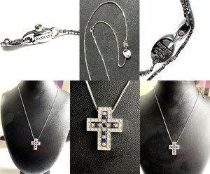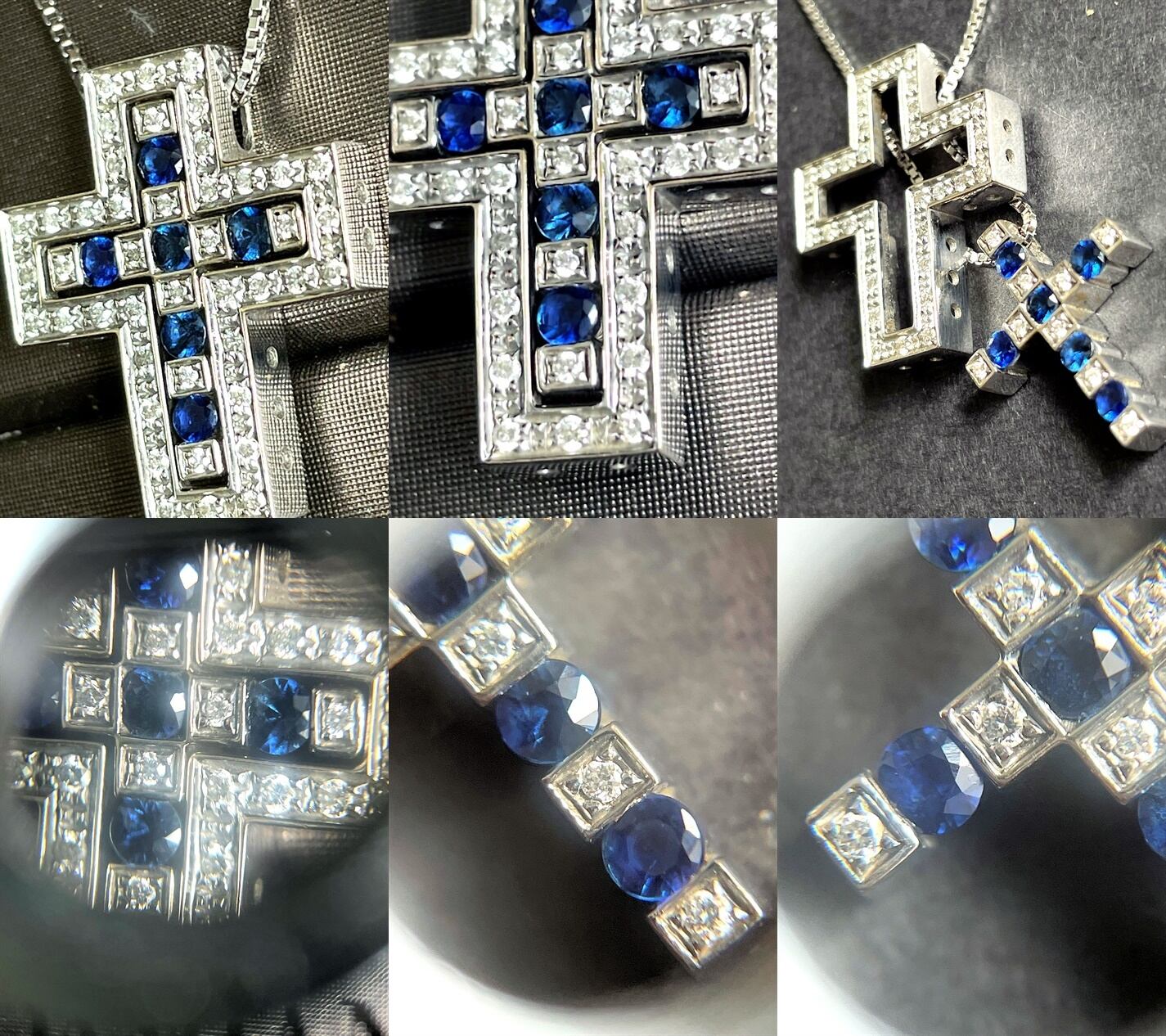 ホワイトゴールドにダイヤモンド×サファイアの組み合わせで、立体的な二重構造のクロスが胸元で揺れ、華やかな存在感を放ちます。