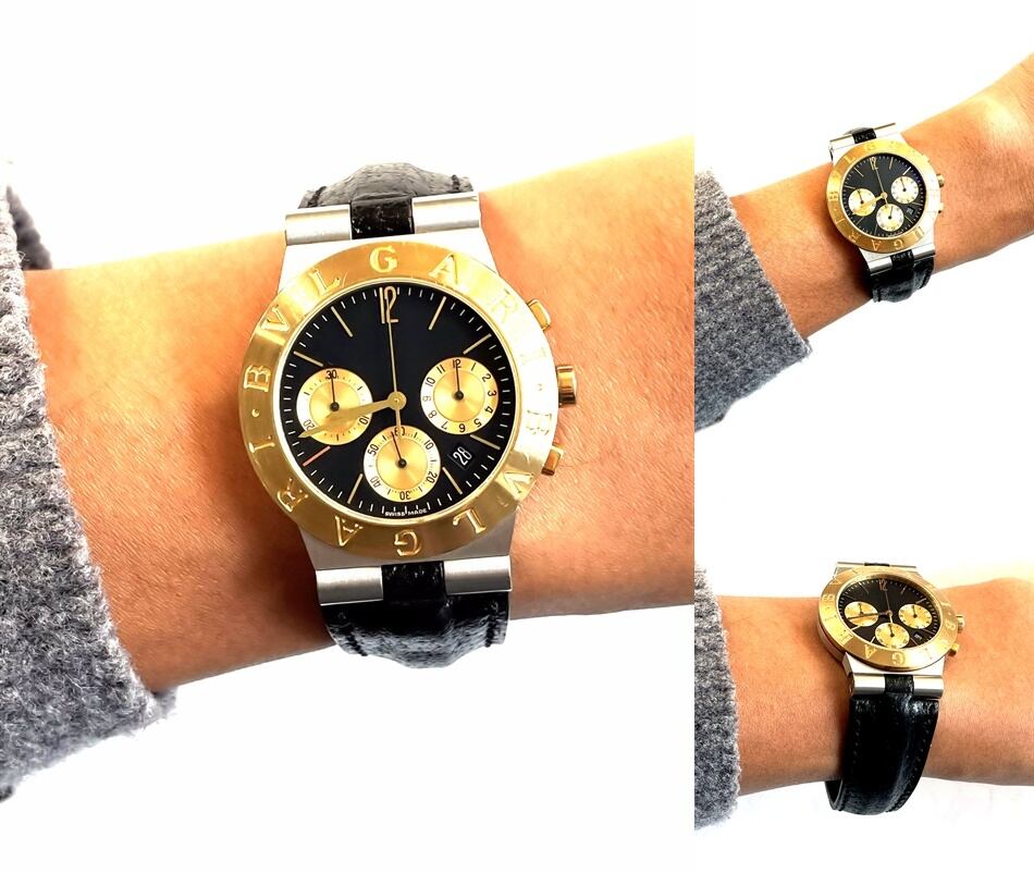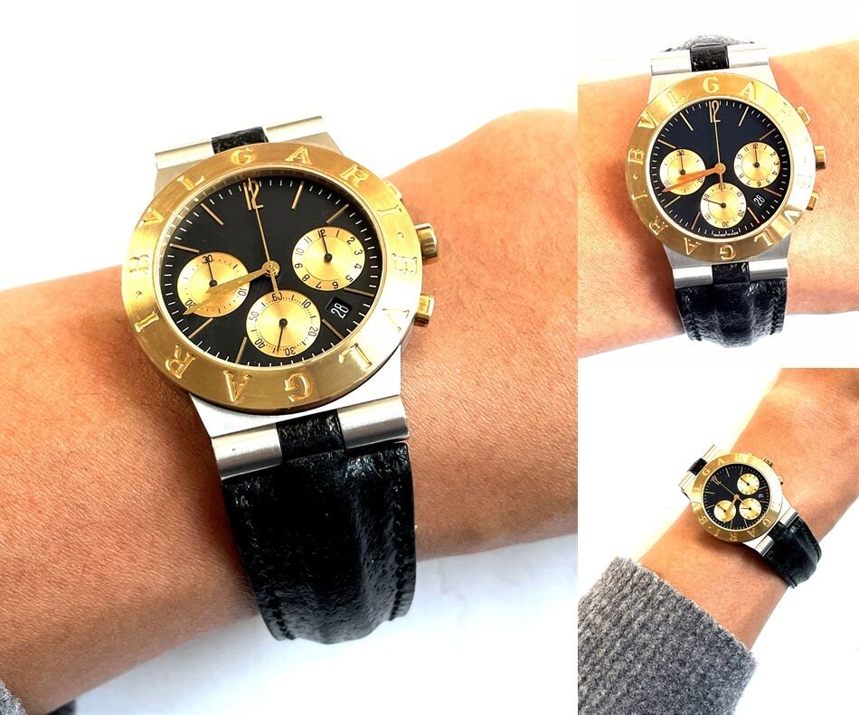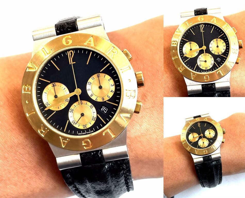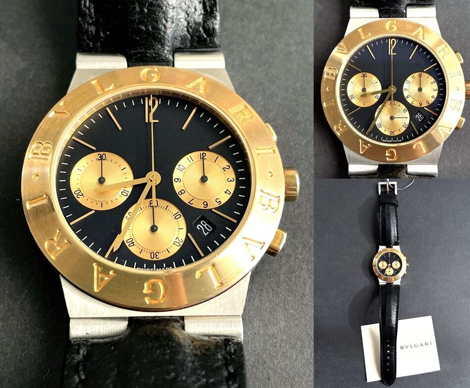 BVLGARI ブルガリ ディアゴノ K18YG/SS 750 イエローゴールド クロノグラフ デイト CH35SG クォーツ 黒文字盤 レザーベルト