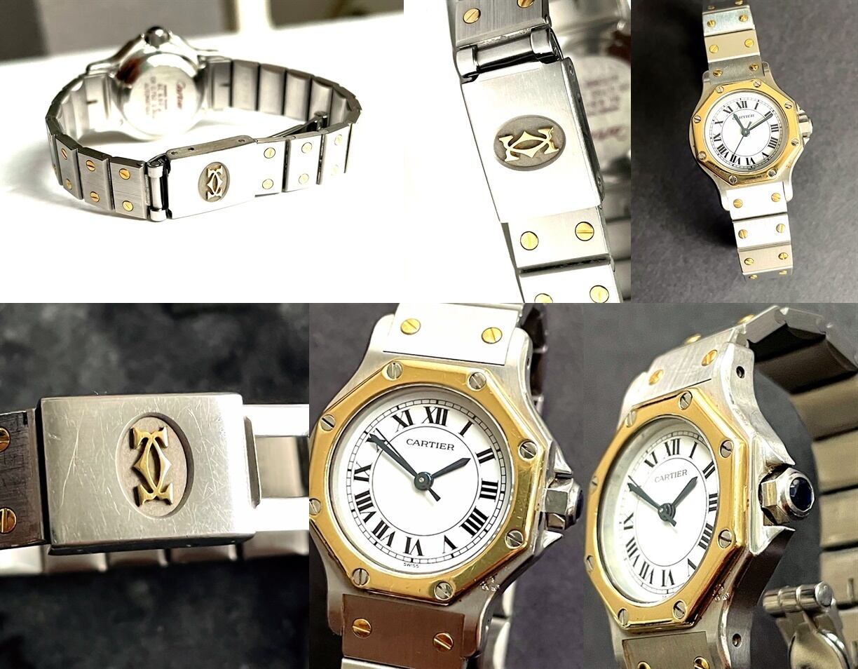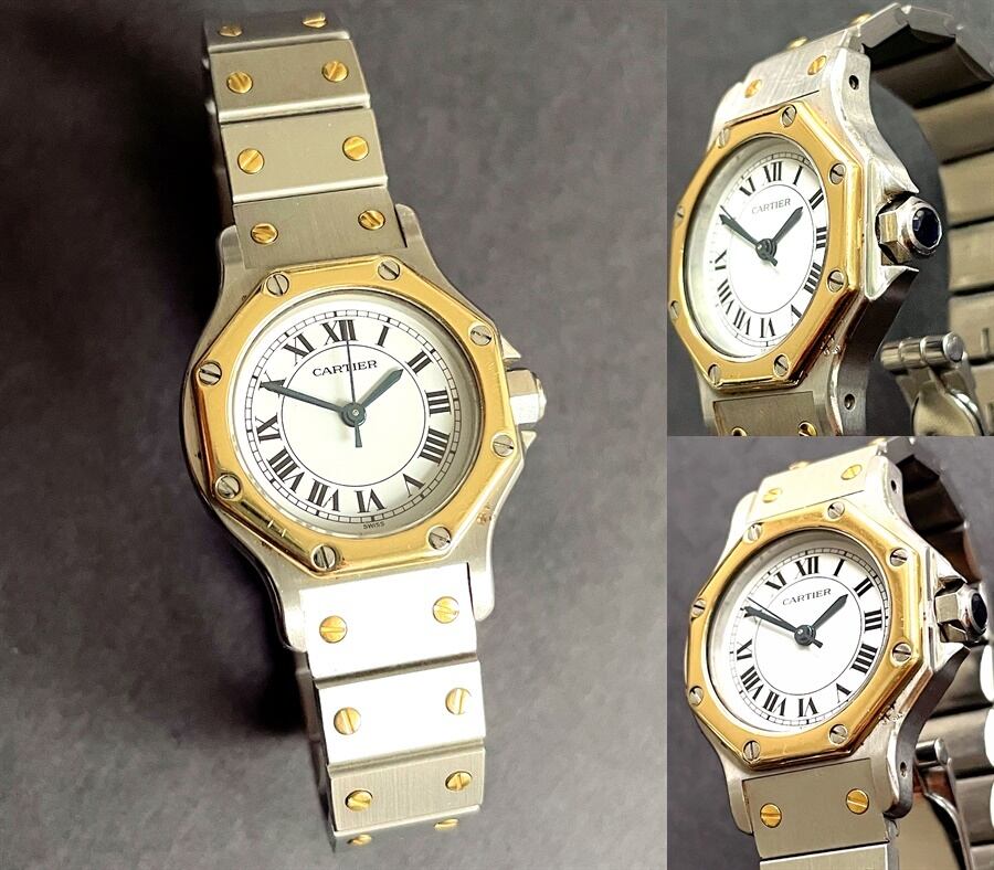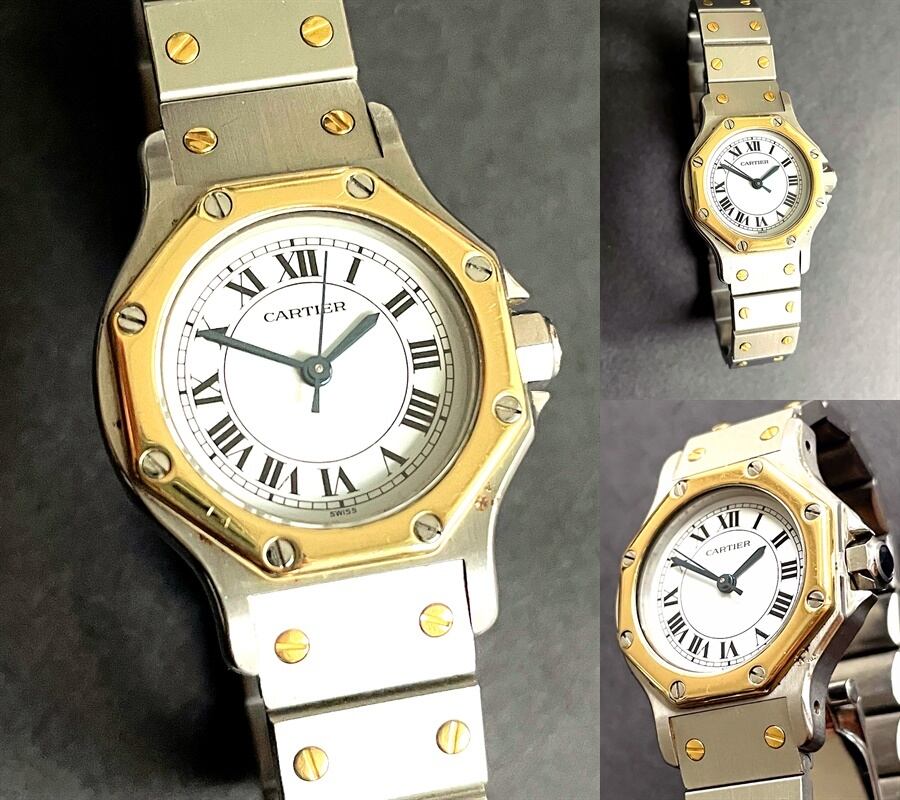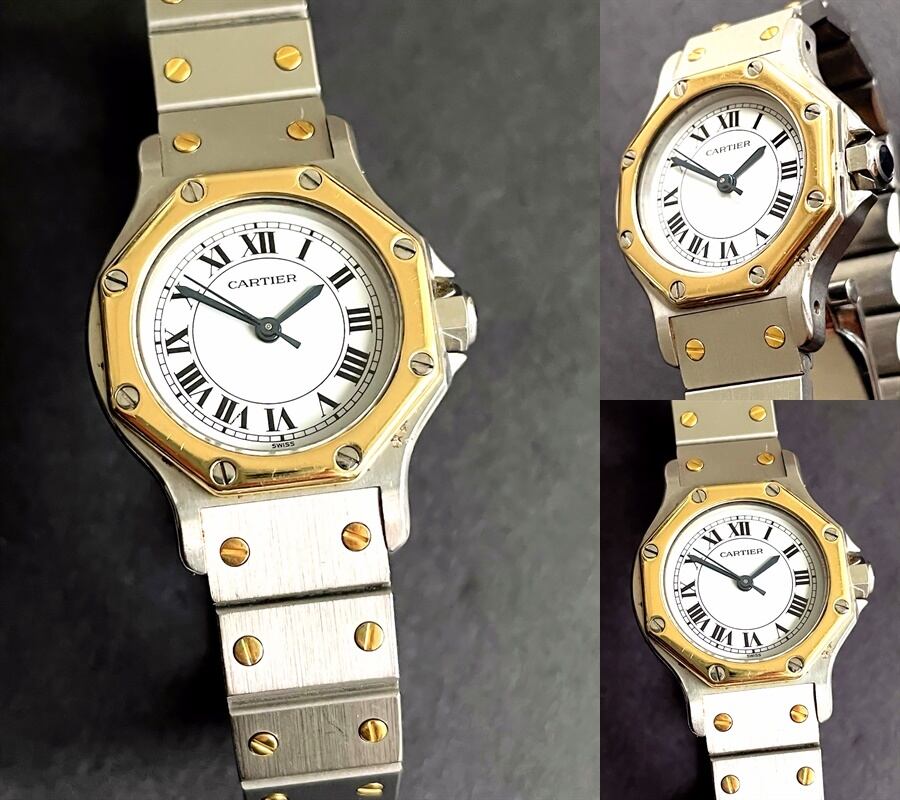 八角形を意味するオクタゴンのモデル名が付けられたサントスオクタゴン、ベゼルやブレスにK18YGゴールドを使用しており高級感があり、ラグジュアリーウォッチの先駆け的な名品です。
