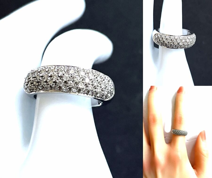 ホワイトゴールドのリングに無数のダイヤモンドがパヴェセッティングされた豪華な指輪です。