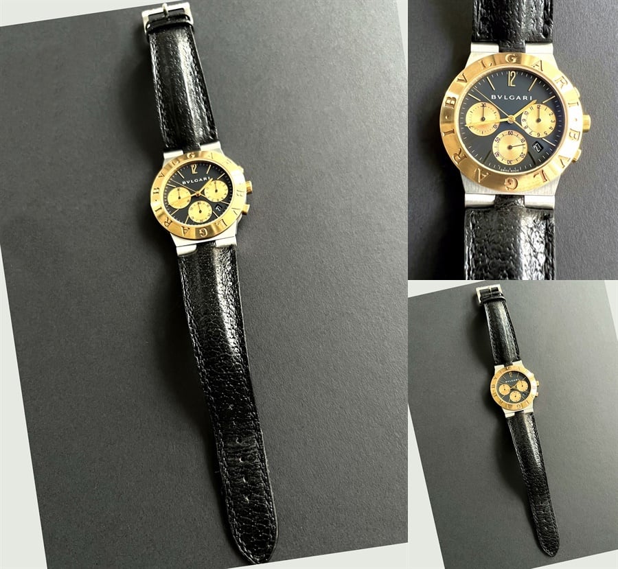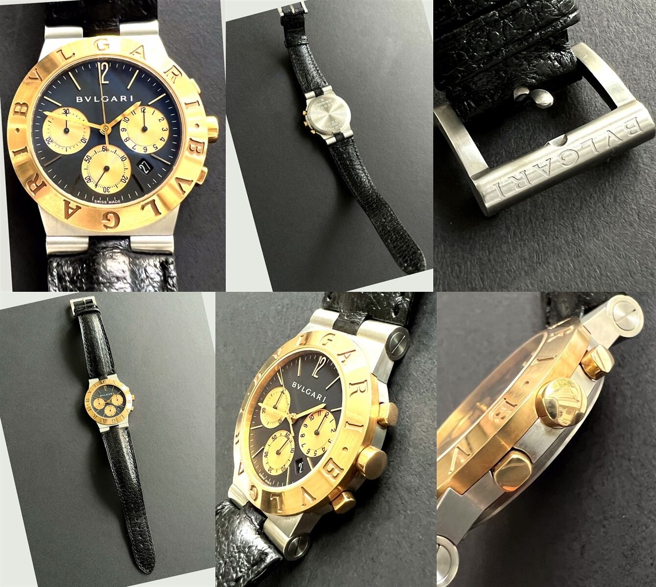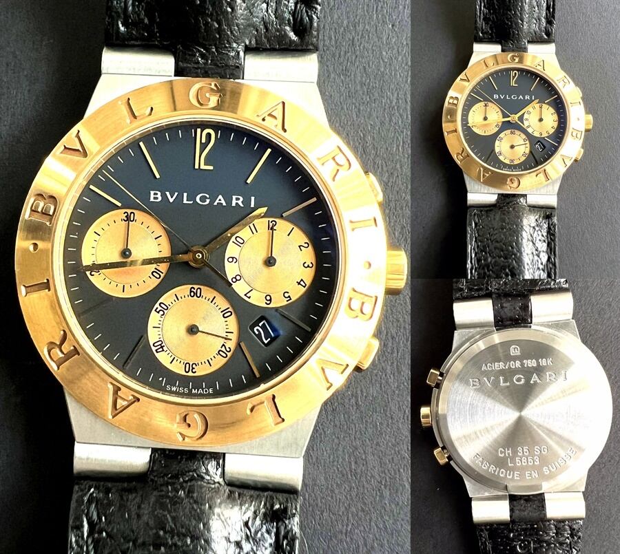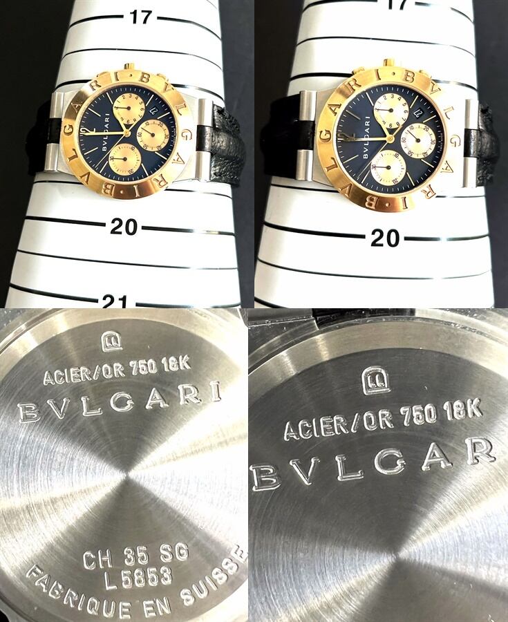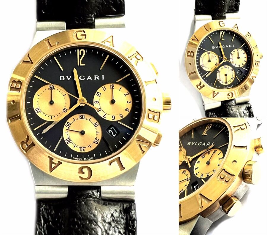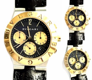 BVLGARI ブルガリ K18 YG ゴールド ディアゴノ クロノグラフ ブラック デイト メンズ レザー 時計 純正 CH35SG