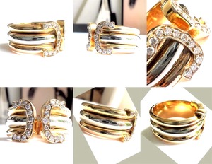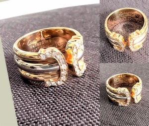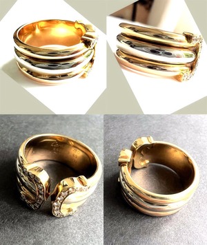 ホワイトゴールド、ピンクゴールド、イエローゴールドのスリーカラーとなっているスタイリッシュで豪華なダイヤモンドリングです。