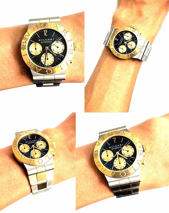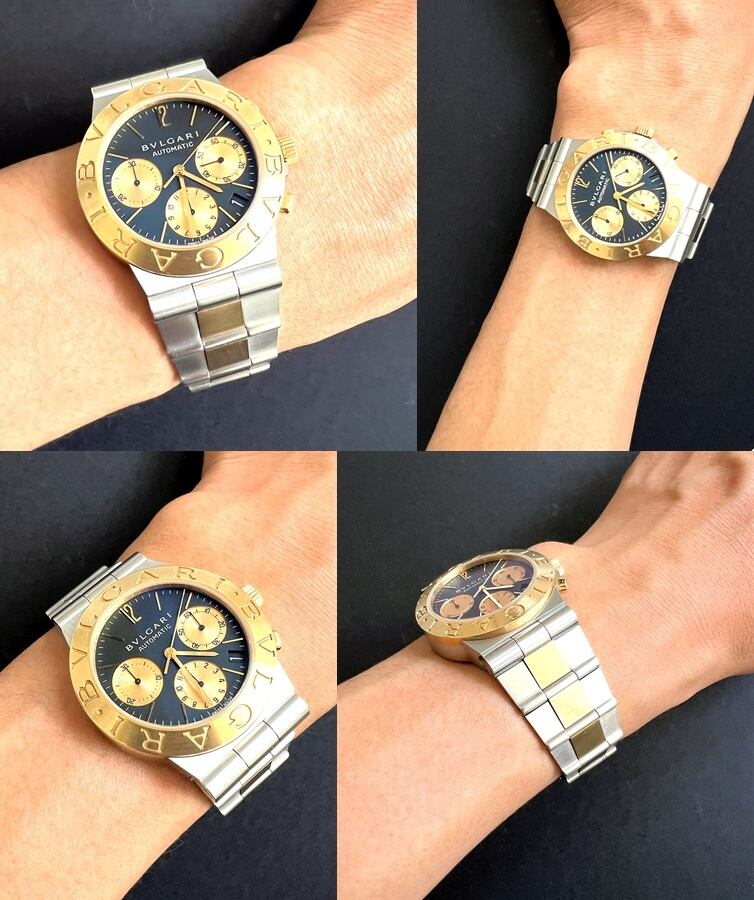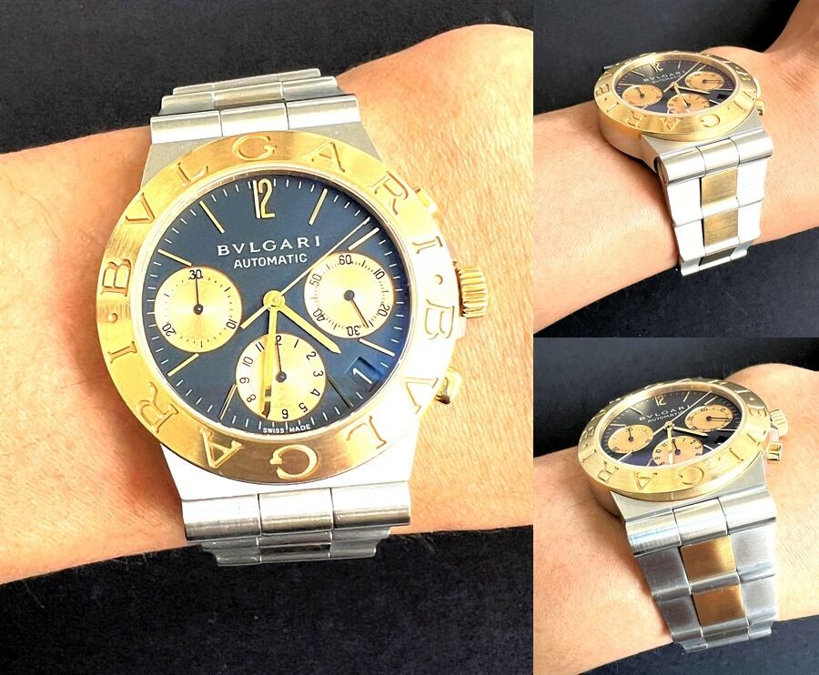 通常のディアゴノと違い、ブレスやベゼル、サイドのリューズ、クロノボタンにはK18イエローゴールドを使用している、ワンランク上のラグジュアリーでドレッシーな時計です。