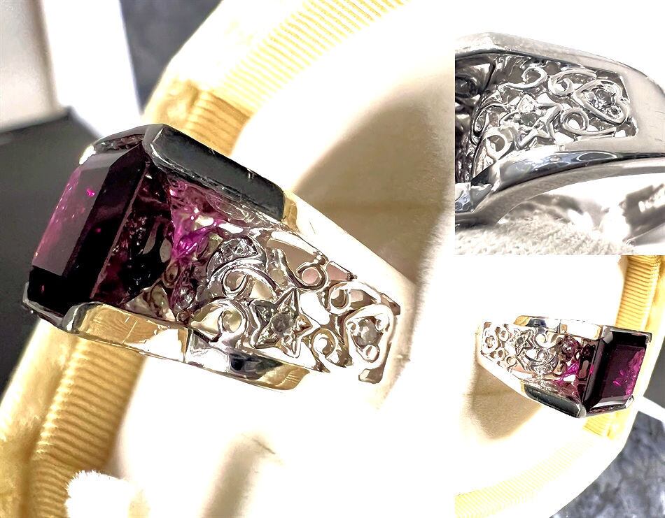 フロントには6.66カラットの大粒のガーネットが美しく輝きます、両サイドには星とハートをモチーフにしたデザインで、ダイヤモンドが詰められております。