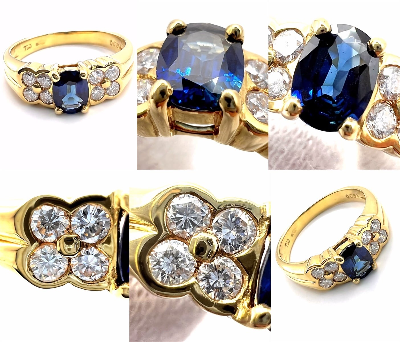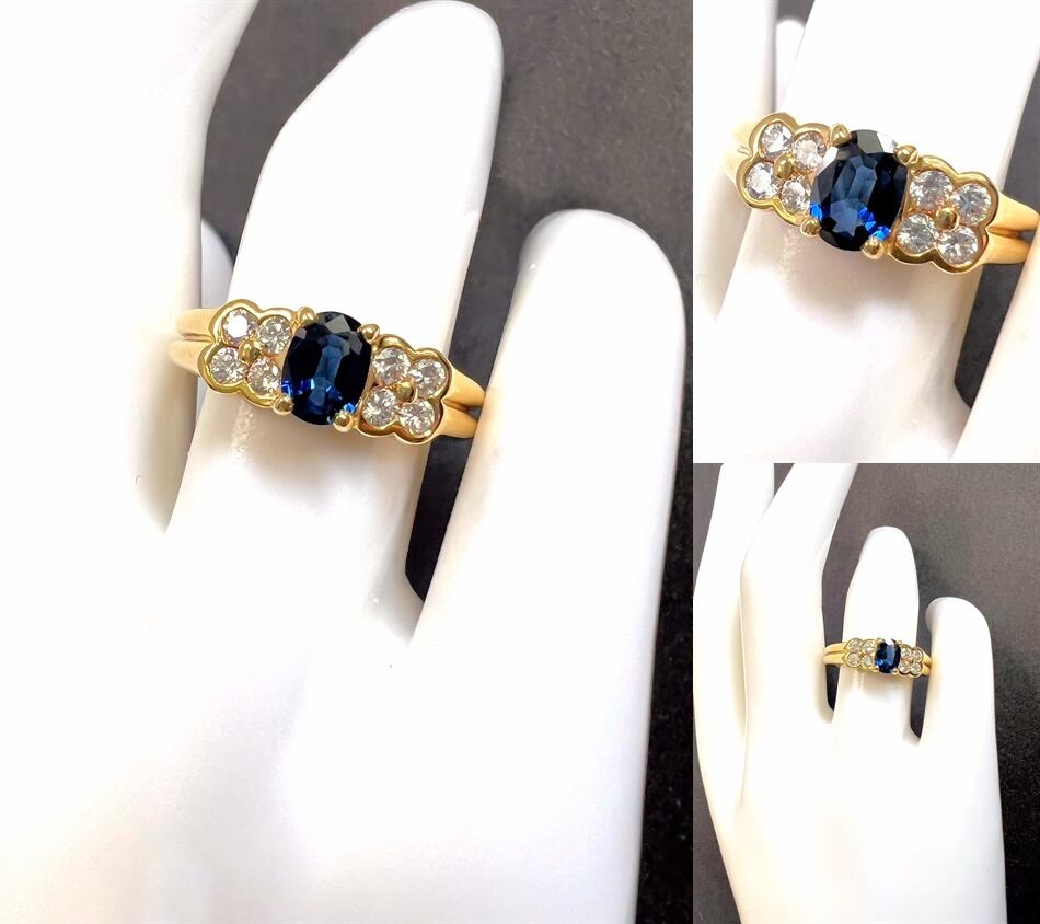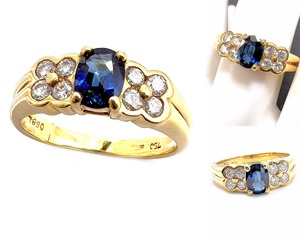 透明度のとても高いブルーサファイアにダイヤモンドが9Pデザインされ、その美しさはため息が出るほどです。