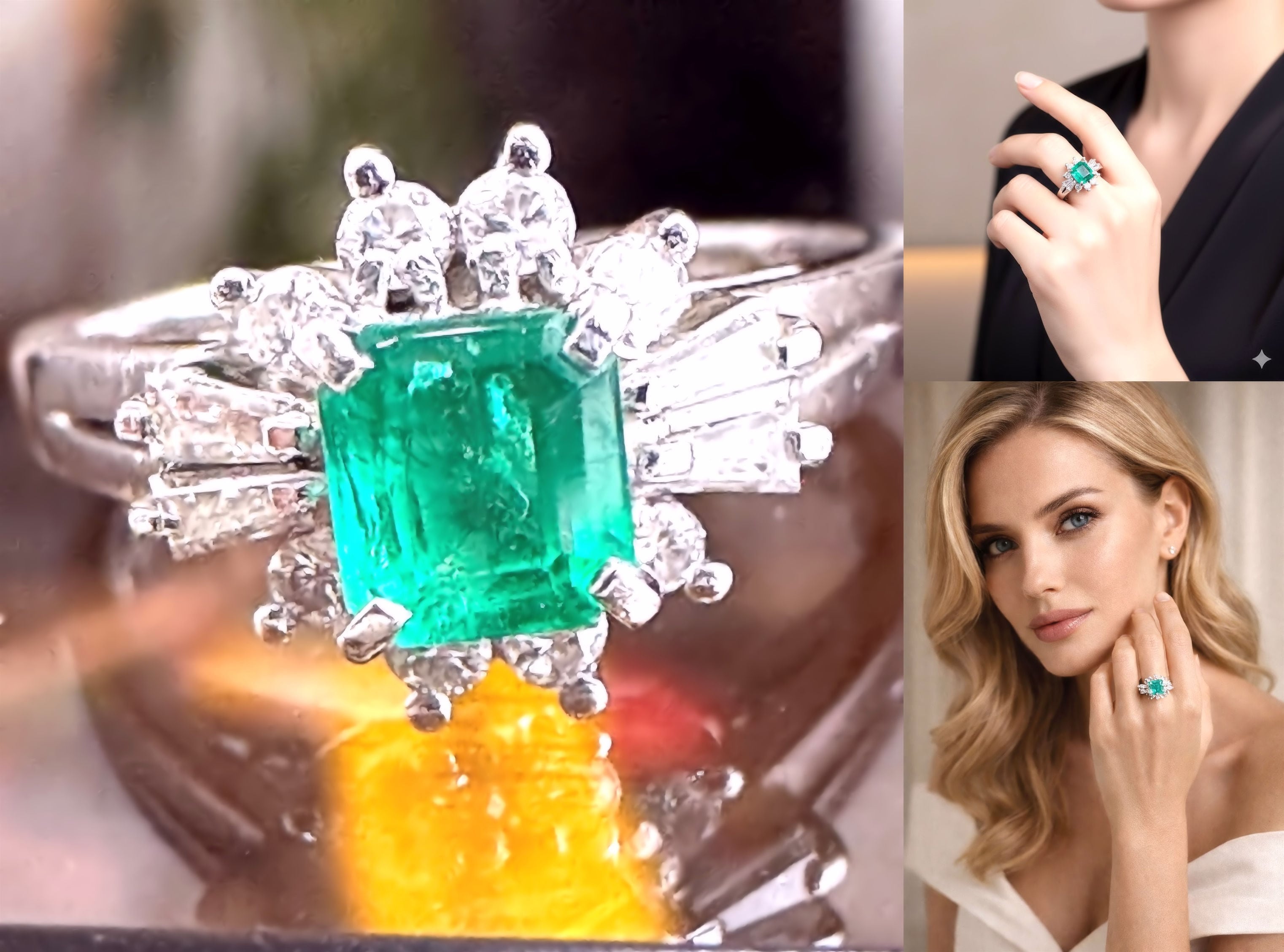 上質なプラチナ素材に、クラリティAクラスの田崎の厳選された上質なダイヤモンドとエメラルドが合計13石を重ね合わせた、上品で高級感あるエメラルドダイヤモンドリング。