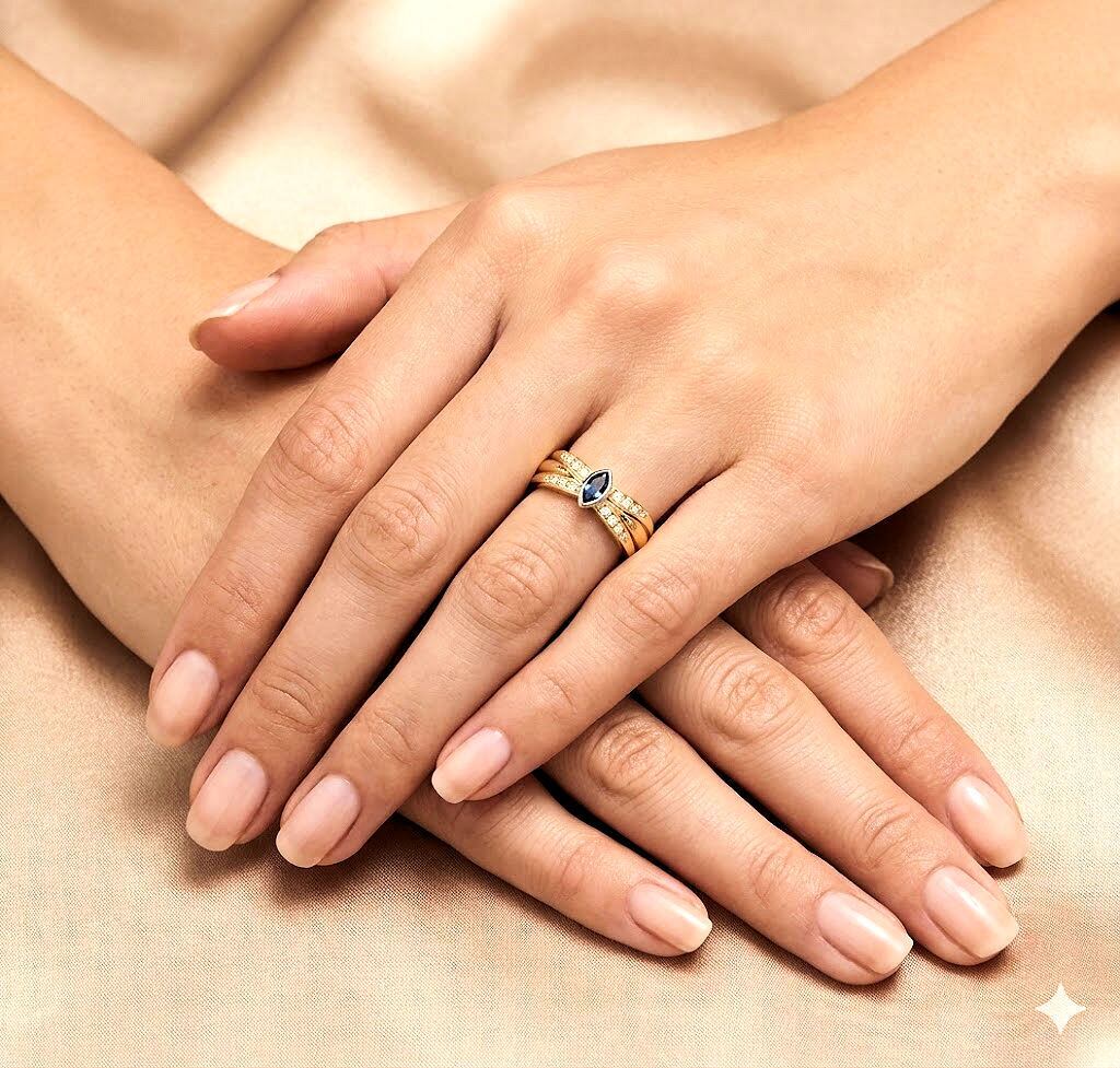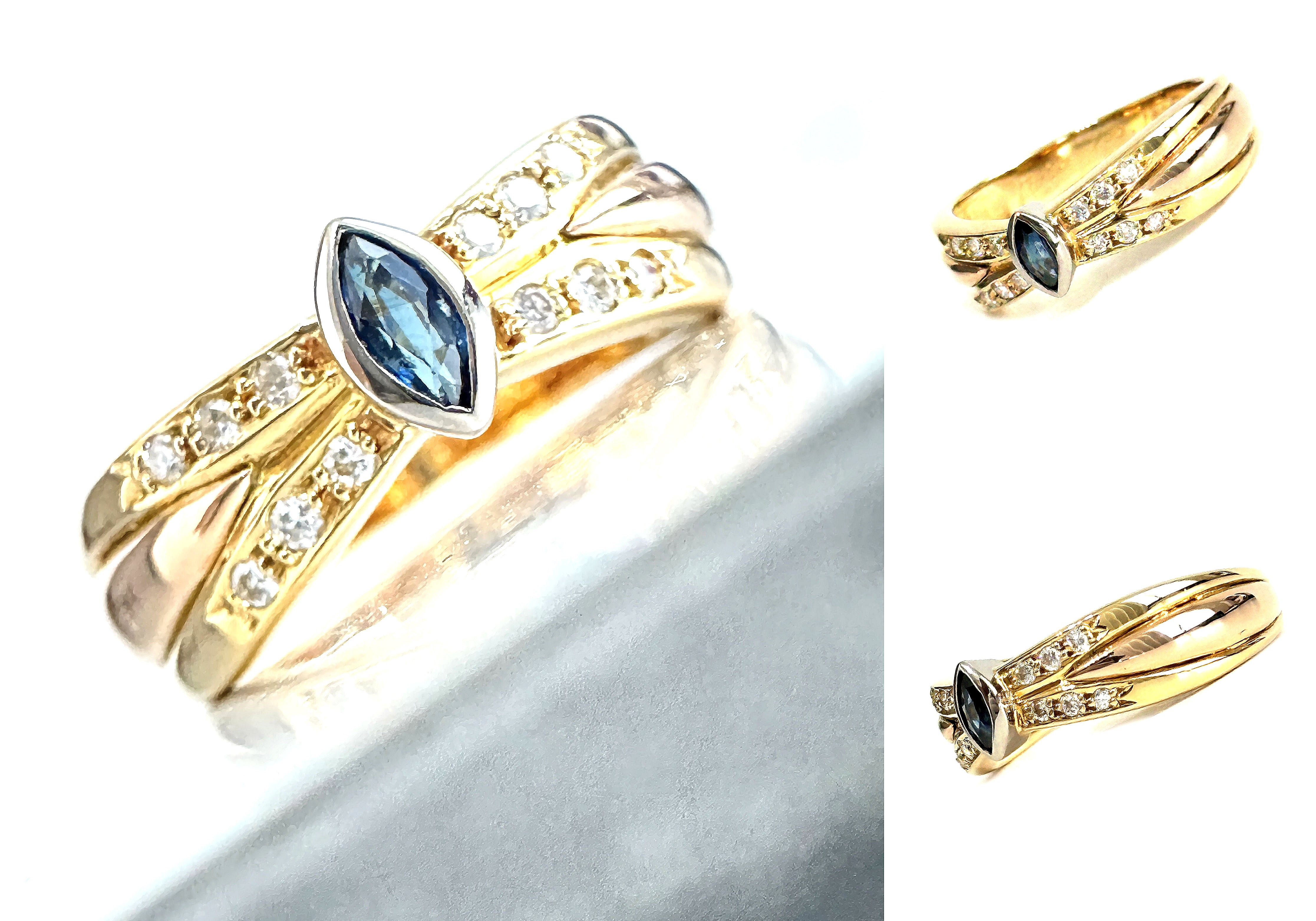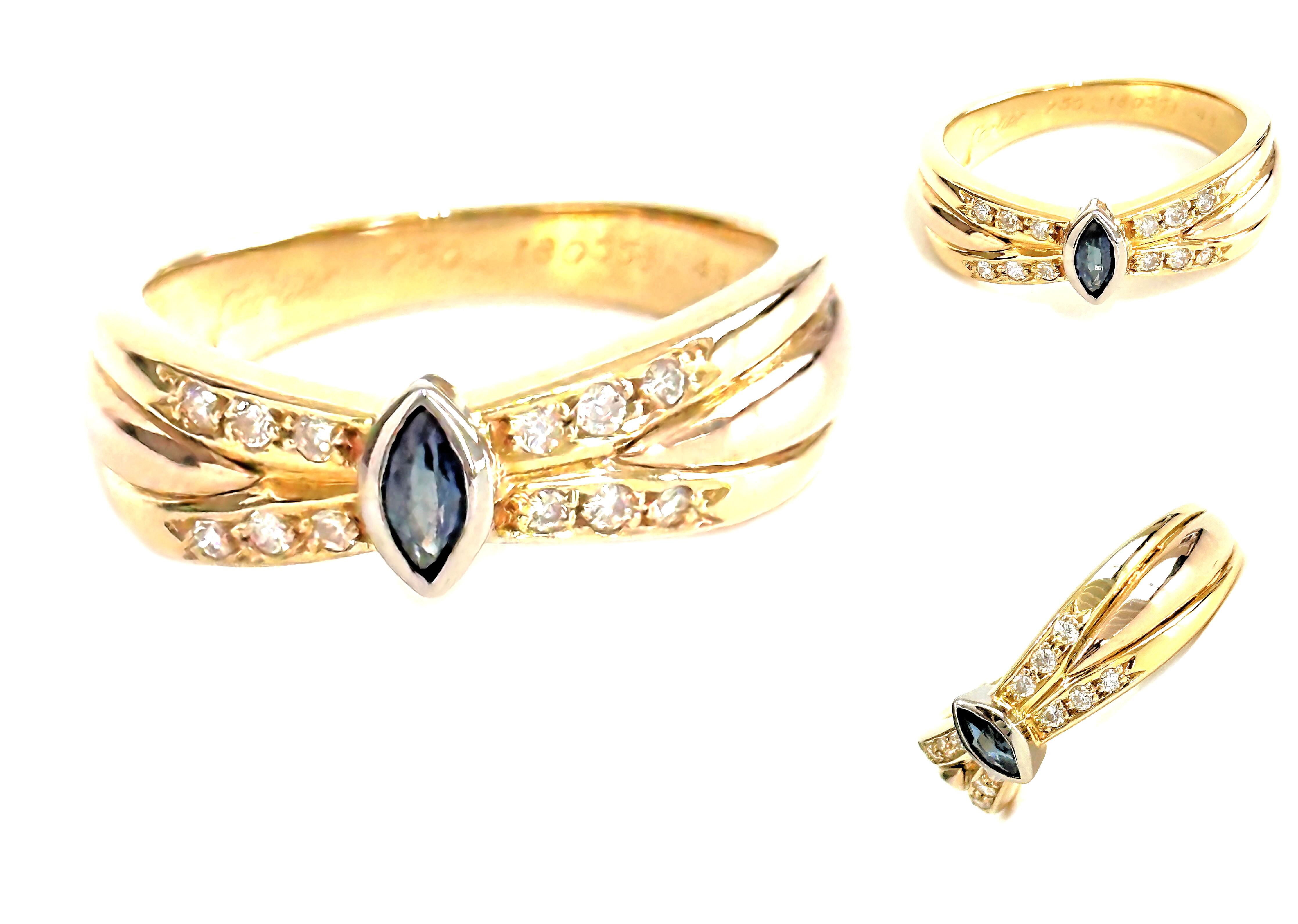 シャープなダークトーンのマーキスカットサファイアが上品で大人の色気を漂わせます。