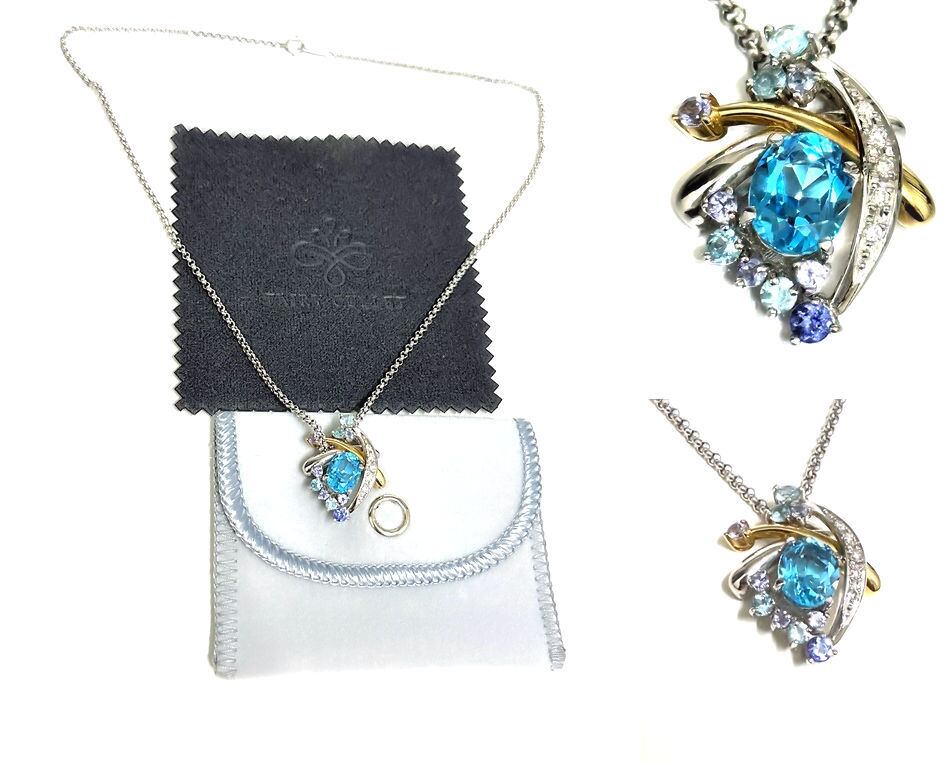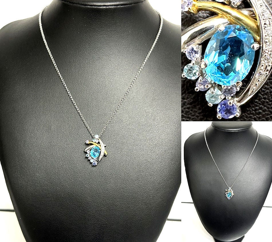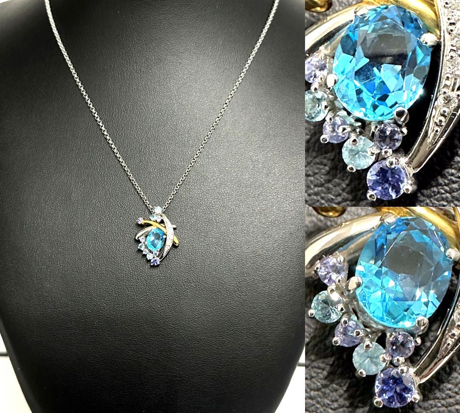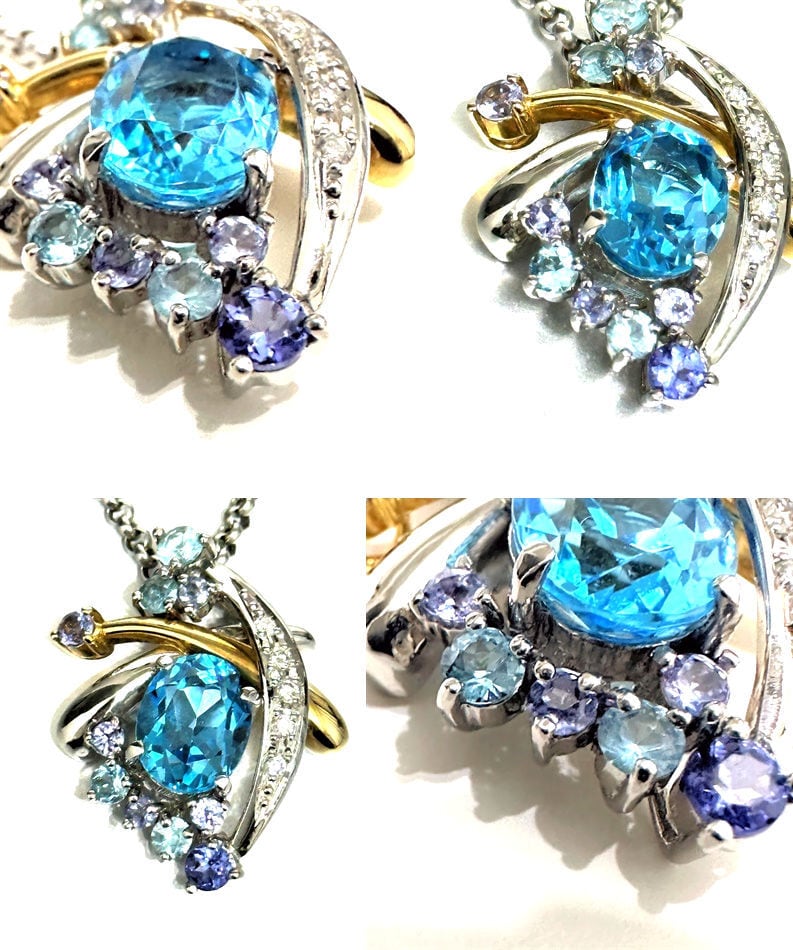2カラット以上の大粒のトパーズの透明度は圧巻の美しさ、ダイヤモンドやトルマリンなどの色鮮やかな宝石をセッティングした豪華なペンダントです。